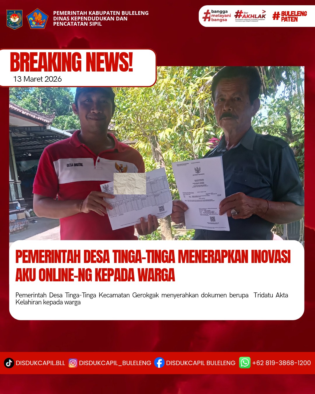 Pemerintah Kabupaten Buleleng melalui Dinas Kependudukan dan Pecatatan Sipil (Disdukcapil) Kabupaten Buleleng memaksimalkan serta mempermudah pelayanan kependudukan masyarakat dengan beberapa inovasi, melalui aplikasi AKU Online-NG. Dimana dalam penerapan aplikasi Aku Online-NG tersebut masyarakat tidak perlu lagi datang ke Dinas Dukcapil untuk melakukan pelayanan langsung cukup dengan datang ke Desa nanti akan dibantu oleh operator Desa masing-masing. Di Desa Tinga-Tinga Kecamatan Gerokgak, telah diserahkan dokumen kependudukan berupa Akta Kelahiran atas nama GEDE SUKRADA dan NYOMAN SAWERSI dan Kartu Keluarga atas nama GEDE SUKRADA warga Banjar Dinas Juntal, yang diserahkan langsung oleh Operator AkuOnline Desa Tinga-Tinga, Jumat (13/3).