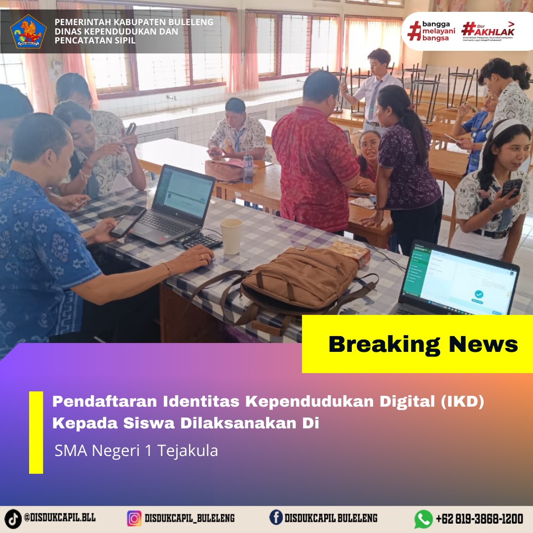 Menerapkan aturan pemerintah tersebut, Dinas Kependudukan dan Pencatatan Sipil Kabupaten Buleleng menyelenggarakan Pendaftaran Identitas Kependudukan Digital ke sekolah-sekolah, Dinas, Lembaga dan Perusahaan secara bergilir setiap harinya. Kali ini pelaksanaan pendaftaran Identitas Kependudukan Digital kepada siswa dan guru yang dilaksanakan di SMA Negeri 1 Tejakula, Selasa (9/9).