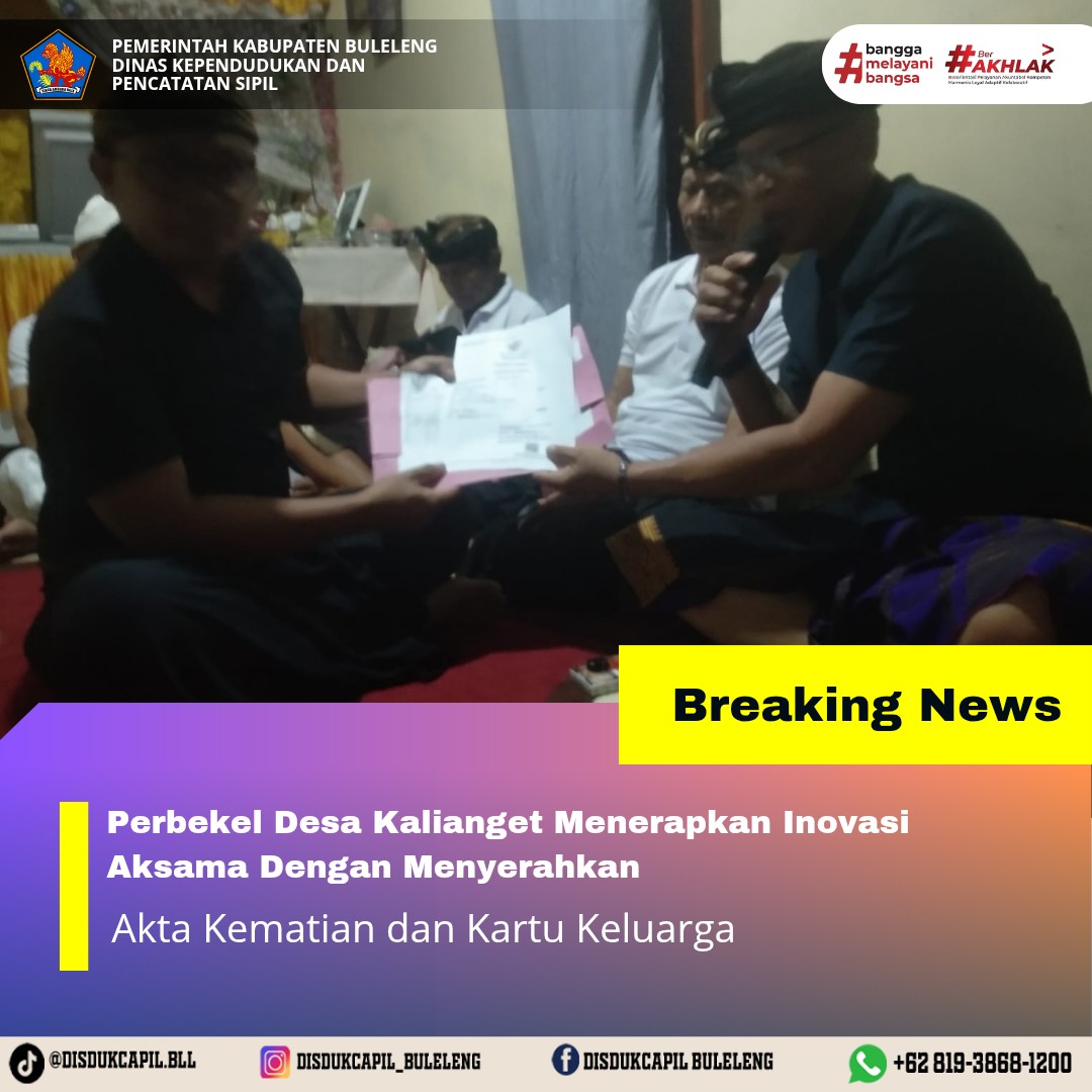 Pemerintah Kabupaten Buleleng melalui Dinas Kependudukan dan Pecatatan Sipil (Disdukcapil) Kabupaten Buleleng memaksimalkan serta mempermudah pelayanan kependudukan masyarakat dengan beberapa inovasi, yakni BALITA (Bayi Lahir Berakta), NYAKSI (Menyerahkan Akta Kawin Saat Acara Perkawinan) dan AKSAMA ( Akta Kematian Diserahkan Saat Masih Berduka) melalui aplikasi Aku Online-NG. Di Desa Kalianget Kecamatan Seririt, telah diterapkan program Aksama (Akta Kematian Diserahkan Saat Masih Berduka) yang dilakukan secara langsung oleh Perbekel Desa Kalianget  Ketut Nanda Kusuma dengan menyerahkan Akta Kematian dan Kartu Keluarga warga Desa Kalianget, Selasa (12/8).