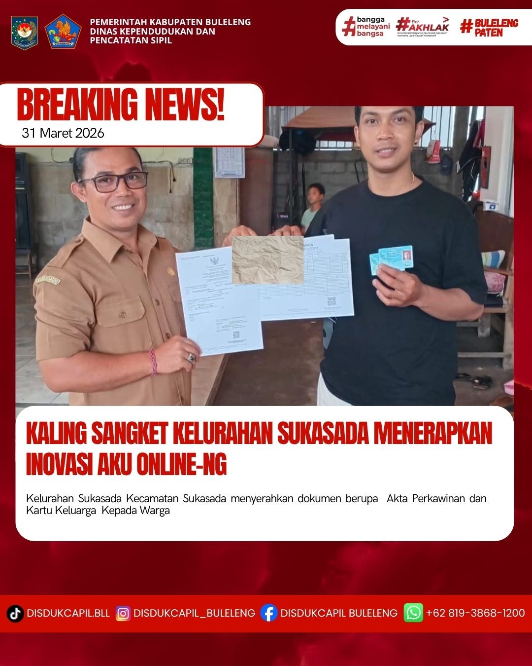 Pemerintah Kabupaten Buleleng melalui Dinas Kependudukan dan Pecatatan Sipil (Disdukcapil) Kabupaten Buleleng memaksimalkan serta mempermudah pelayanan kependudukan masyarakat dengan beberapa inovasi, melalui aplikasi AKU Online-NG. Dimana dalam penerapan aplikasi Aku Online-NG tersebut masyarakat tidak perlu lagi datang ke Dinas Dukcapil untuk melakukan pelayanan langsung, cukup dengan datang ke Desa nanti akan dibantu oleh operator Desa masing-masing. Di Kelurahan Sukasada Kecamatan Sukasada, telah diserahkan dokumen kependudukan berupa Akta Perkawinan, KTP dan Kartu Keluarga atas nama Komang Agus Suwidnyana warga Lingkungan Sangket, Kelurahan Sukasada yang diserahkan langsung oleh Kepala Lingkungan Sangket Kelurahan Sukasada Kecamatan Sukasada, Kabupaten Buleleng, Selasa (31/3).