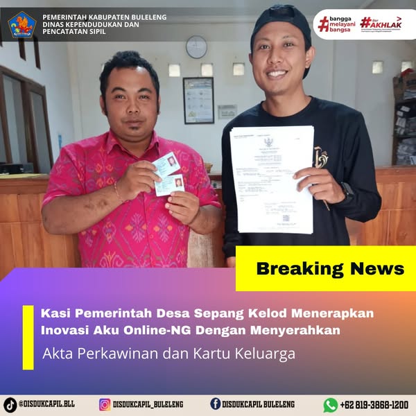 Pemerintah Kabupaten Buleleng melalui Dinas Kependudukan dan Pecatatan Sipil (Disdukcapil) Kabupaten Buleleng memaksimalkan serta mempermudah pelayanan kependudukan masyarakat dengan beberapa inovasi, melalui aplikasi AKU Online-NG. Dimana dalam penerapan aplikasi Aku Online-NG tersebut masyarakat tidak perlu lagi datang ke Dinas Dukcapil untuk melakukan pelayanan langsung cukup dengan datang ke Desa nanti akan dibantu oleh operator Desa masing-masing. Di Desa Sepang Kelod Kecamatan Busungbiu, telah diserahkan dokumen kependudukan berupa Akta Perkawinan dan Kartu Keluarga atas nama Ketut Ngurah Edy Sunarto warga Banjar Dinas Asah Badung Desa Sepang Kelod, Kecamatan Busungbiu, yang diserahkan langsung oleh Kasi Pemerintahan Desa Sepang Kelod, Kamis (21/8).