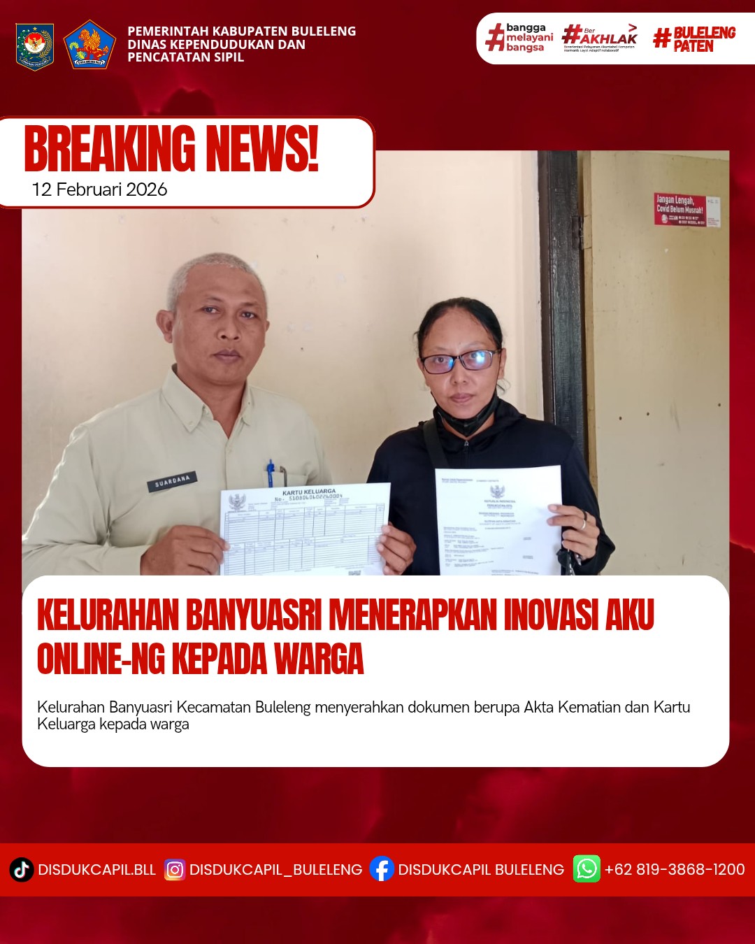 Pemerintah Kabupaten Buleleng melalui Dinas Kependudukan dan Pecatatan Sipil (Disdukcapil) Kabupaten Buleleng memaksimalkan serta mempermudah pelayanan kependudukan masyarakat dengan beberapa inovasi, melalui aplikasi AKU Online-NG. Dimana dalam penerapan aplikasi Aku Online-NG tersebut masyarakat tidak perlu lagi datang ke Dinas Dukcapil untuk melakukan pelayanan langsung cukup dengan datang ke Desa nanti akan dibantu oleh operator Desa masing-masing. Di Kelurahan Banyuasri Kecamatan Buleleng, telah diserahkan dokumen kependudukan berupa Akta Kematian atas nama Made Warita yang diserahkan langsung oleh Kelurahan Banyuasri, Kecamatan Buleleng, Kabupaten Buleleng, Kamis (12/2).
