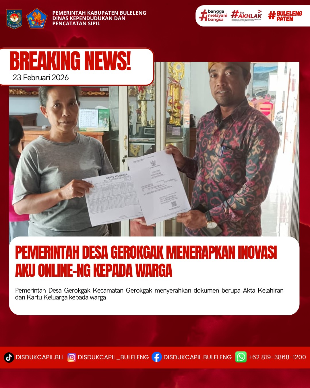 Pemerintah Kabupaten Buleleng melalui Dinas Kependudukan dan Pecatatan Sipil (Disdukcapil) Kabupaten Buleleng memaksimalkan serta mempermudah pelayanan kependudukan masyarakat dengan beberapa inovasi, melalui aplikasi AKU Online-NG. Dimana dalam penerapan aplikasi Aku Online-NG tersebut masyarakat tidak perlu lagi datang ke Dinas Dukcapil untuk melakukan pelayanan langsung cukup dengan datang ke Desa nanti akan dibantu oleh operator Desa masing-masing. Di Desa Gerokgak Kecamatan Gerokgak, telah diserahkan dokumen kependudukan berupa Akta Kelahiran atas nama Gede Prayoga Adi Pratama dan Kartu Keluarga atas nama Putu Budiasa yang diserahkan langsung oleh Kelian Banjar Dinas Gerokgak Desa Gerokgak, Senin (23/2).