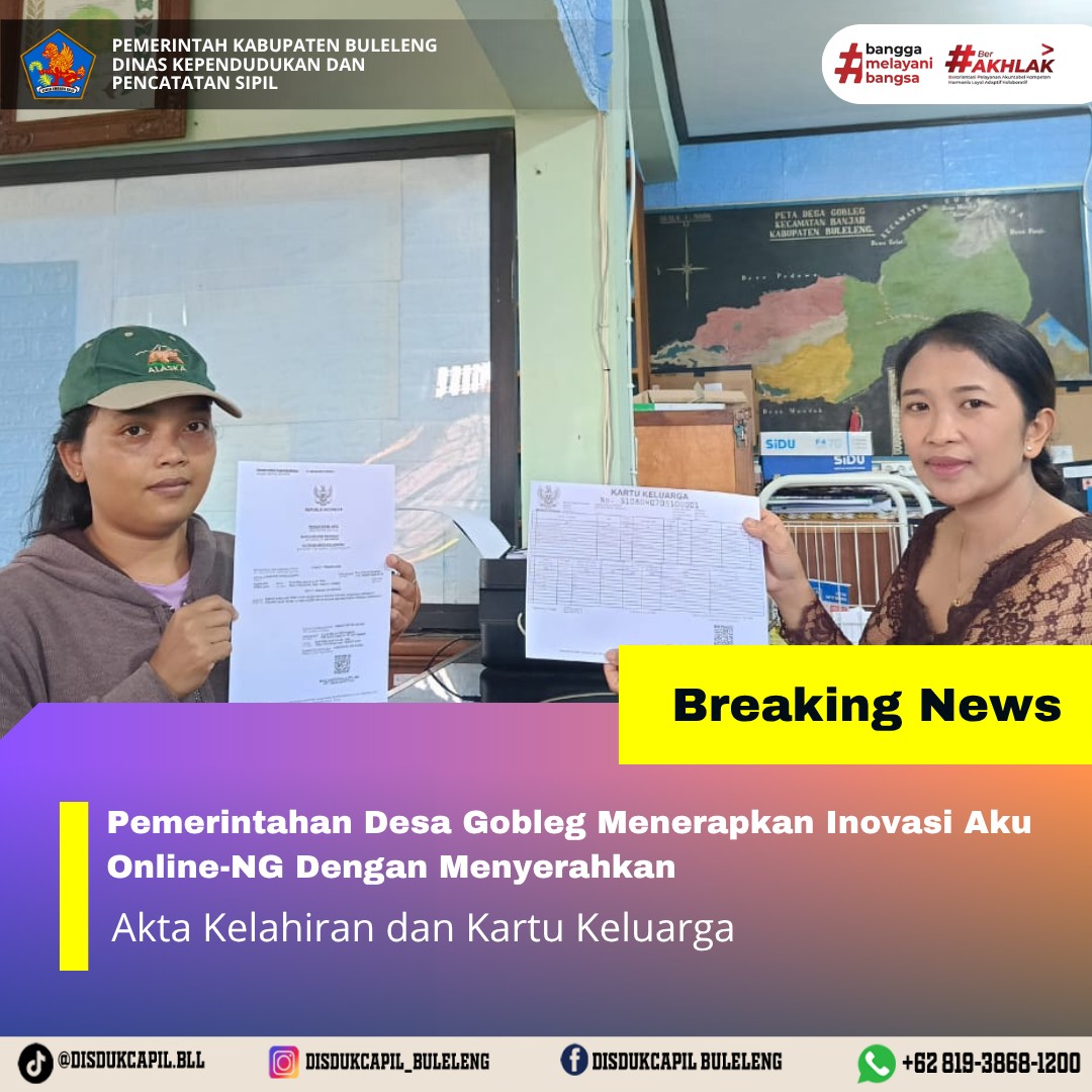 Pemerintah Kabupaten Buleleng melalui Dinas Kependudukan dan Pecatatan Sipil (Disdukcapil) Kabupaten Buleleng memaksimalkan serta mempermudah pelayanan kependudukan masyarakat dengan beberapa inovasi, melalui aplikasi AKU Online-NG. Dimana dalam penerapan aplikasi Aku Online-NG tersebut masyarakat tidak perlu lagi datang ke Dinas Dukcapil untuk melakukan pelayanan langsung cukup dengan datang ke Desa nanti akan dibantu oleh operator Desa masing-masing. Di Desa Gobleg Kecamatan Banjar, telah diserahkan dokumen kependudukan berupa Akta Kelahiran dan Kartu Keluarga atas nama Kadek Nova Ariana yang diserahkan langsung oleh staf administrasi Desa Gobleg bertempat di Kantor Perbekel Desa Gobleg, Kecamatan Banjar, Kabupaten Buleleng, Kamis (2/10).