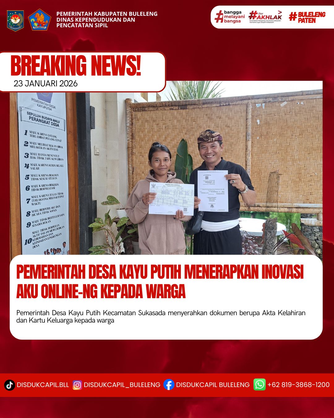 Pemerintah Kabupaten Buleleng melalui Dinas Kependudukan dan Pecatatan Sipil (Disdukcapil) Kabupaten Buleleng memaksimalkan serta mempermudah pelayanan kependudukan masyarakat dengan beberapa inovasi, melalui aplikasi AKU Online-NG. Dimana dalam penerapan aplikasi Aku Online-NG tersebut masyarakat tidak perlu lagi datang ke Dinas Dukcapil untuk melakukan pelayanan langsung cukup dengan datang ke Desa nanti akan dibantu oleh operator Desa masing-masing. Di Desa Kayu Putih Kecamatan Sukasada, telah diserahkan dokumen kependudukan berupa Akta Kelahiran atas nama Ketut Devika Vania Putri dan Kartu Keluarga atas nama Ketut Sumerta warga Banjar Dinas Melaka, Desa Kayu Putih, Kecamatan Sukasada yang diserahkan secara langsung oleh Kasi Pemerintahan Desa Kayu Putih Kecamatan Sukasada, Jumat (23/1).