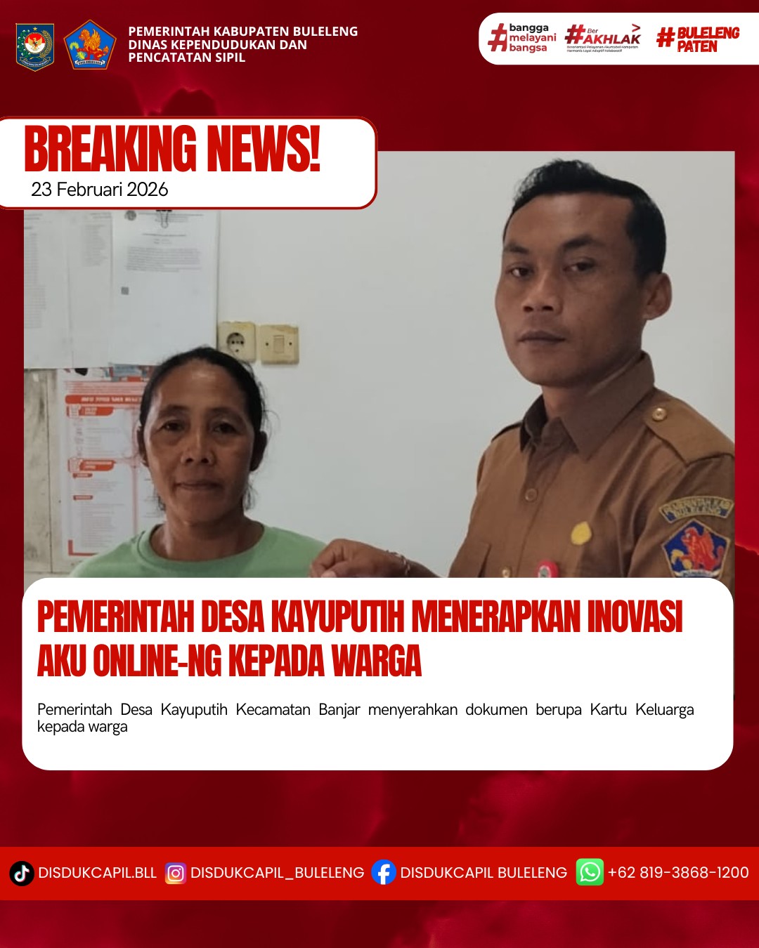 Pemerintah Kabupaten Buleleng melalui Dinas Kependudukan dan Pecatatan Sipil (Disdukcapil) Kabupaten Buleleng memaksimalkan serta mempermudah pelayanan kependudukan masyarakat dengan beberapa inovasi, melalui aplikasi AKU Online-NG. Dimana dalam penerapan aplikasi Aku Online-NG tersebut masyarakat tidak perlu lagi datang ke Dinas Dukcapil untuk melakukan pelayanan langsung cukup dengan datang ke Desa nanti akan dibantu oleh operator Desa masing-masing. Di Desa Kayuputih Kecamatan Banjar, telah diserahkan dokumen kependudukan berupa Kartu Keluarga atas nama Kadek Bagia warga Banjar Dinas Menagung Desa Kayuputih yang diserahkan secara langsung oleh Pemerintah Desa Kayuputih Kecamatan Banjar, Senin (23/2).