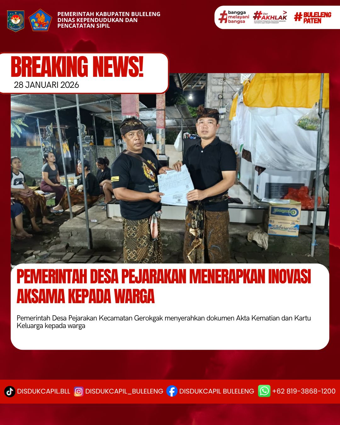 Pemerintah Kabupaten Buleleng melalui Dinas Kependudukan dan Pecatatan Sipil (Disdukcapil) Kabupaten Buleleng memaksimalkan serta mempermudah pelayanan kependudukan masyarakat dengan beberapa inovasi, yakni BALITA (Bayi Lahir Berakta), NYAKSI (Menyerahkan Akta Kawin Saat Acara Perkawinan) dan AKSAMA ( Akta Kematian Diserahkan Saat Masih Berduka) melalui aplikasi Aku Online-NG. Di Desa Pejarakan Kecamatan Gerokgak, telah diterapkan program Aksama (Akta Kematian Diserahkan Saat Masih Berduka) yang dilakukan secara langsung oleh Kaur Perencanaan Desa Pejarakan dengan menyerahkan Akta Kematian atas nama Ni Nengah Sri dan Kartu Keluarga atas nama Gede Retiana kepada keluarga almarhum di Banjar Dinas Marga Garuda, Desa Pejarakan, Kecamatan Gerokgak, Rabu (28/1).