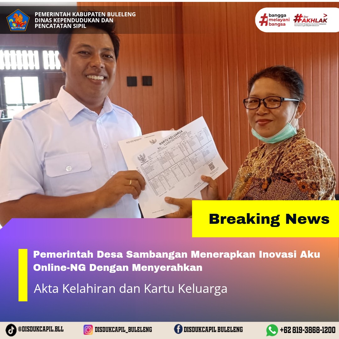 Pemerintah Kabupaten Buleleng melalui Dinas Kependudukan dan Pecatatan Sipil (Disdukcapil) Kabupaten Buleleng memaksimalkan serta mempermudah pelayanan kependudukan masyarakat dengan beberapa inovasi, melalui aplikasi AKU Online-NG. Dimana dalam penerapan aplikasi Aku Online-NG tersebut masyarakat tidak perlu lagi datang ke Dinas Dukcapil untuk melakukan pelayanan langsung cukup dengan datang ke Desa nanti akan dibantu oleh operator Desa masing-masing. Di Desa Sambangan Kecamatan Sukasada, telah diserahkan dokumen kependudukan berupa Akta Kelahiran atas nama Muhammad Elzard Maulana Putra dan Kartu Keluarga atas nama Riyan Yamanda Putra diserahkan oleh Kasi Pemerintahan Desa Sambangan bertempat di Kantor Perbekel Desa Sambangan, Kecamatan Sukasada, Kabupaten Buleleng, Rabu (31/12).