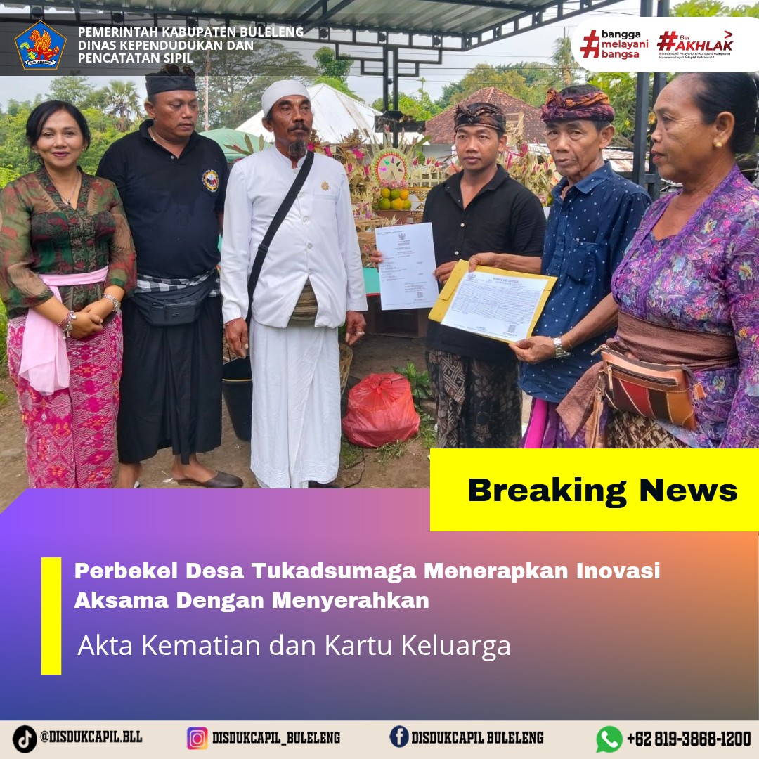 Pemerintah Kabupaten Buleleng melalui Dinas Kependudukan dan Pecatatan Sipil (Disdukcapil) Kabupaten Buleleng memaksimalkan serta mempermudah pelayanan kependudukan masyarakat dengan beberapa inovasi, yakni BALITA (Bayi Lahir Berakta), NYAKSI (Menyerahkan Akta Kawin Saat Acara Perkawinan) dan AKSAMA ( Akta Kematian Diserahkan Saat Masih Berduka) melalui aplikasi Aku Online. Di Desa Tukadsumaga Kecamatan Gerokgak, telah diterapkan program Aksama (Akta Kematian Diserahkan Saat Masih Berduka) yang dilakukan secara langsung oleh Perbekel Tukadsumaga ANAK AGUNG SRI WATHI dengan menyerahkan Akta Kematian atas nama Luh Asri dan Kartu Keluarga atas nama I Made Ginata kepada pihak keluarga almarhum di Banjar Dinas Buluh Desa Tukadusumaga Kecamatan Gerokgak, Kamis (11/12).