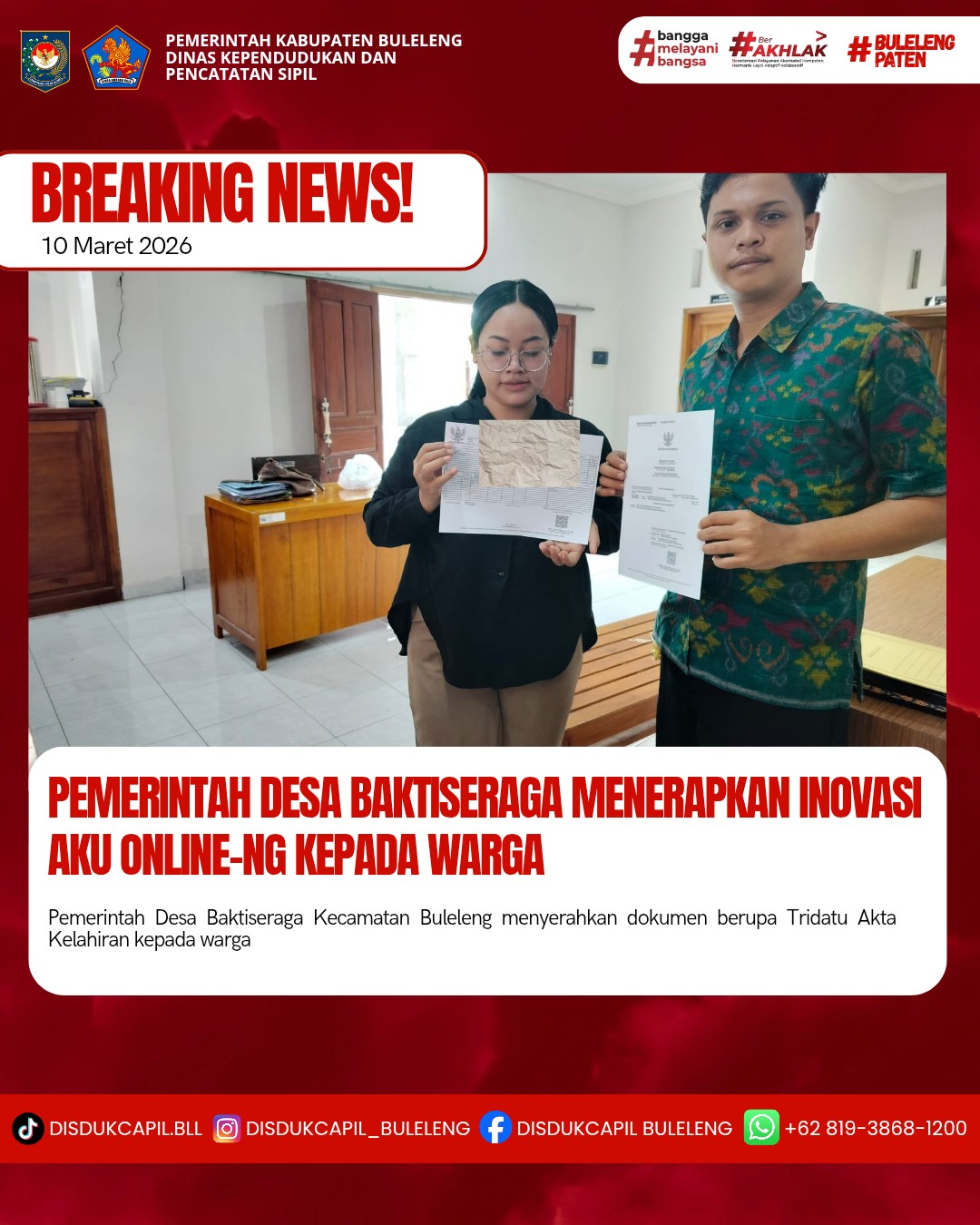 Pemerintah Kabupaten Buleleng melalui Dinas Kependudukan dan Pecatatan Sipil (Disdukcapil) Kabupaten Buleleng memaksimalkan serta mempermudah pelayanan kependudukan masyarakat dengan beberapa inovasi, melalui aplikasi AKU Online-NG. Dimana dalam penerapan aplikasi Aku Online-NG tersebut masyarakat tidak perlu lagi datang ke Dinas Dukcapil untuk melakukan pelayanan langsung cukup dengan datang ke Desa nanti akan dibantu oleh operator Desa masing-masing. Di Desa Baktiseraga Kecamatan Buleleng, telah diserahkan dokumen kependudukan berupa Tridatu Akta Kelahiran yang diserahkan langsung oleh Kasi Pelayanan Desa Baktiseraga bertempat di kantor Perbekel  Desa Baktiseraga, Kecamatan Buleleng, Kabupaten Buleleng, Selasa (10/3).