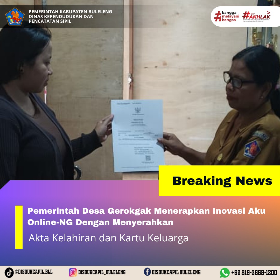 Pemerintah Kabupaten Buleleng melalui Dinas Kependudukan dan Pecatatan Sipil (Disdukcapil) Kabupaten Buleleng memaksimalkan serta mempermudah pelayanan kependudukan masyarakat dengan beberapa inovasi, melalui aplikasi AKU Online. Dimana dalam penerapan aplikasi Aku Online tersebut masyarakat tidak perlu lagi datang ke Dinas Dukcapil untuk melakukan pelayanan langsung cukup dengan datang ke Desa nanti akan dibantu oleh operator Desa masing-masing. Di Desa Gerokgak Kecamatan Gerokgak telah diserahkan dokumen kependudukan berupa Akta Kelahiran atas nama Ni Luh Ayu Sarianing dan Kartu Keluarga yang diserahkan oleh Kasi Pemerintahan Desa Gerokgak Kecamatan Gerokgak, Senin (20/10).