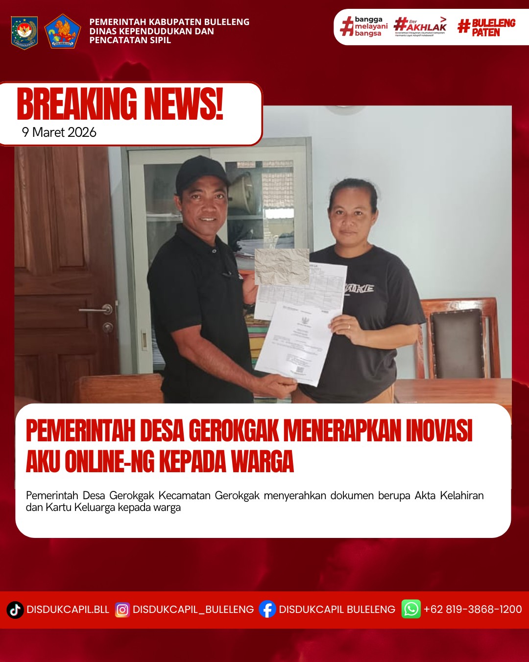 Pemerintah Kabupaten Buleleng melalui Dinas Kependudukan dan Pecatatan Sipil (Disdukcapil) Kabupaten Buleleng memaksimalkan serta mempermudah pelayanan kependudukan masyarakat dengan beberapa inovasi, melalui aplikasi AKU Online-NG. Dimana dalam penerapan aplikasi Aku Online-NG tersebut masyarakat tidak perlu lagi datang ke Dinas Dukcapil untuk melakukan pelayanan langsung cukup dengan datang ke Desa nanti akan dibantu oleh operator Desa masing-masing. Di Desa Gerokgak Kecamatan Gerokgak, telah diserahkan dokumen kependudukan berupa Akta Kelahiran anak atas nama Nyoman Angga Widiasa dan Kartu Keluarga Gede Heri Susiawan yang diserahkan langsung oleh Kelian Banjar Dinas Gerokgak,, Kecamatan Gerokgak, Kabupaten Buleleng, Senin (9/3).