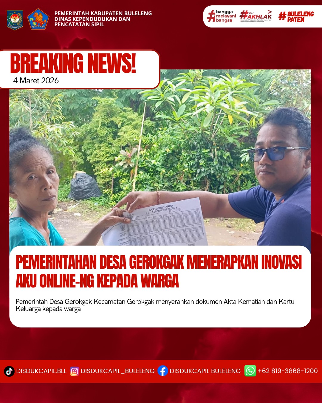 Pemerintah Kabupaten Buleleng melalui Dinas Kependudukan dan Pecatatan Sipil (Disdukcapil) Kabupaten Buleleng memaksimalkan serta mempermudah pelayanan kependudukan masyarakat dengan beberapa inovasi, melalui aplikasi AKU Online-NG. Dimana dalam penerapan aplikasi Aku Online-NG tersebut masyarakat tidak perlu lagi datang ke Dinas Dukcapil untuk melakukan pelayanan langsung cukup dengan datang ke Desa nanti akan dibantu oleh operator Desa masing-masing. Di Desa Gerokgak Kecamatan Gerokgak, telah diserahkan dokumen kependudukan berupa Akta Kematian atas nama Gede Pasek dan Kartu Keluarga atas nama Wayan Kerti yang diserahkan langsung oleh Kelian Banjar Dinas Tamansari Mekar, Desa Gerokgak, Rabu (4/3).