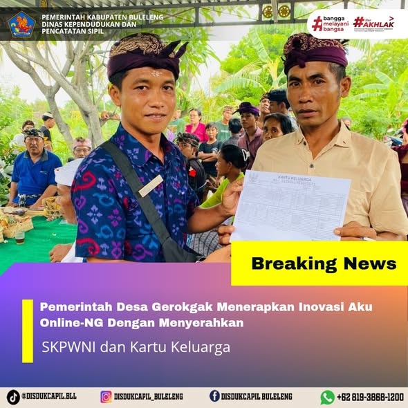 Pemerintah Kabupaten Buleleng melalui Dinas Kependudukan dan Pecatatan Sipil (Disdukcapil) Kabupaten Buleleng memaksimalkan serta mempermudah pelayanan kependudukan masyarakat dengan beberapa inovasi, melalui aplikasi AKU Online. Dimana dalam penerapan aplikasi Aku Online tersebut masyarakat tidak perlu lagi datang ke Dinas Dukcapil untuk melakukan pelayanan langsung cukup dengan datang ke Desa nanti akan dibantu oleh operator Desa masing-masing. Di Desa Gerokgak Kecamatan Gerokgak telah diserahkan dokumen kependudukan berupa SKPWNI atas nama Putu Sujani dan Kartu Keluarga atas nama Komang Wenten yang diserahkan langsung oleh Kasi pemerintahan Desa Gerokgak, Kecamatan Gerokgak, Senin (10/11).