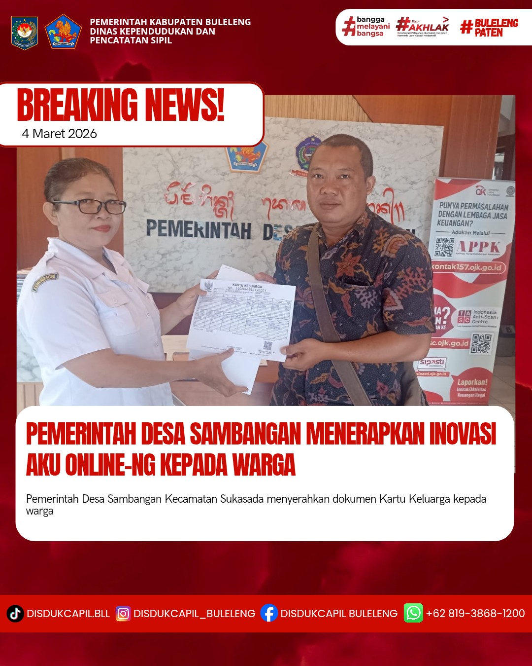 Pemerintah Kabupaten Buleleng melalui Dinas Kependudukan dan Pecatatan Sipil (Disdukcapil) Kabupaten Buleleng memaksimalkan serta mempermudah pelayanan kependudukan masyarakat dengan beberapa inovasi, melalui aplikasi AKU Online-NG. Dimana dalam penerapan aplikasi Aku Online-NG tersebut masyarakat tidak perlu lagi datang ke Dinas Dukcapil untuk melakukan pelayanan langsung cukup dengan datang ke Desa nanti akan dibantu oleh operator Desa masing-masing. Di Desa Sambangan Kecamatan Sukasada, telah diserahkan dokumen kependudukan berupa Kartu Keluarga atas nama Anthonius Yudi Kristanto diserahkan oleh Kasi Pemerintahan Desa Sambangan bertempat di Kantor Perbekel Desa Sambangan, Kecamatan Sukasada, Kabupaten Buleleng, Rabu (4/3).
