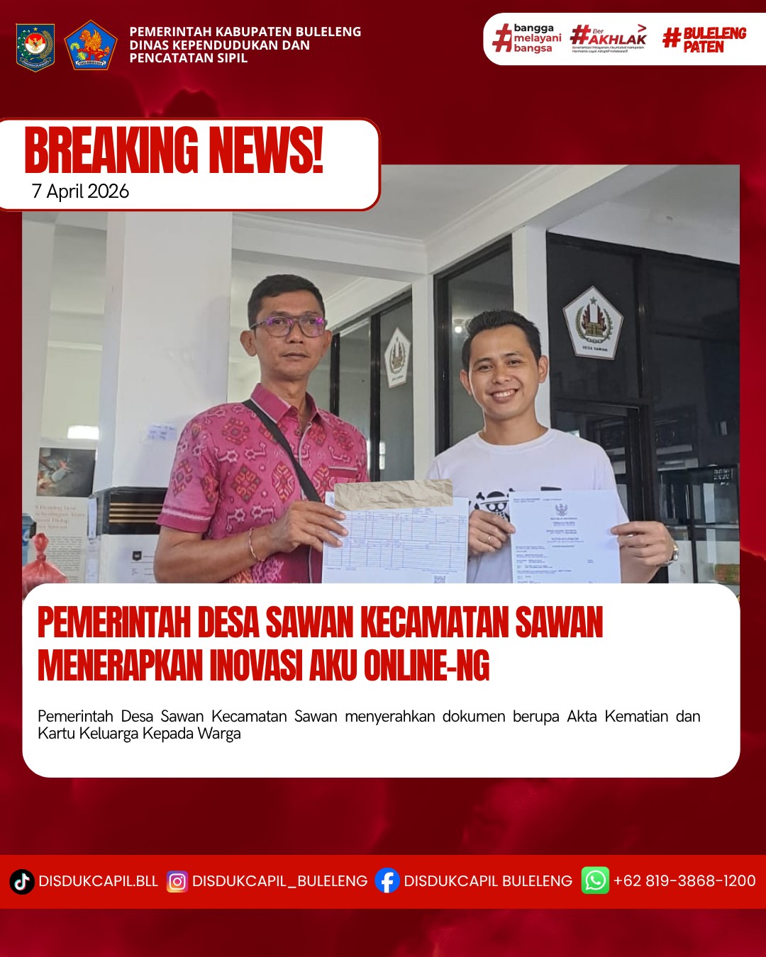 Pemerintah Kabupaten Buleleng melalui Dinas Kependudukan dan Pecatatan Sipil (Disdukcapil) Kabupaten Buleleng memaksimalkan serta mempermudah pelayanan kependudukan masyarakat dengan beberapa inovasi, melalui aplikasi AKU Online-NG. Dimana dalam penerapan aplikasi Aku Online-NG tersebut masyarakat tidak perlu lagi datang ke Dinas Dukcapil untuk melakukan pelayanan langsung cukup dengan datang ke Desa nanti akan dibantu oleh operator Desa masing-masing. Di Desa Sawan Kecamatan Sawan, Pemerintahan Desa Sawan telah menyerahkan dokumen kependudukan berupa Akta Kematian dan Kartu Keluarga atas nama made Putranis yang diserahkan oleh Kadus Banjar Kanginan Desa Sawan, Selasa (7/4).
