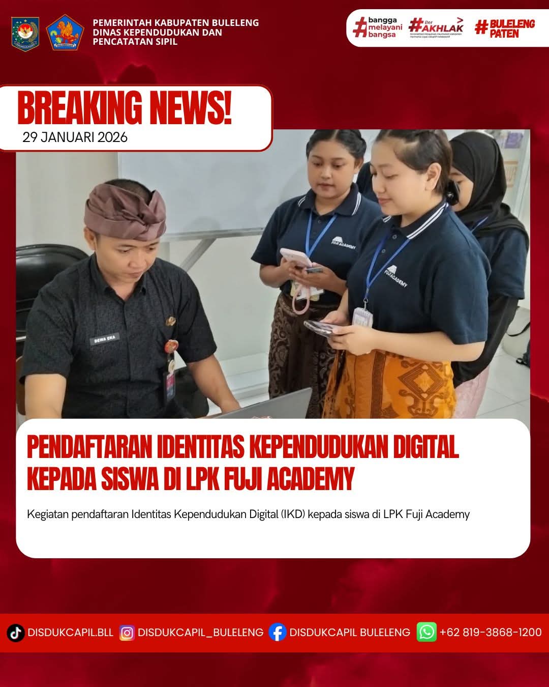 Menerapkan aturan pemerintah tersebut, Dinas Kependudukan dan Pencatatan Sipil Kabupaten Buleleng menyelenggarakan Pendaftaran Identitas Kependudukan Digital ke sekolah-sekolah, Dinas, Lembaga dan Perusahaan secara bergilir setiap harinya. Kali ini pelaksanaan pendaftaran Identitas Kependudukan Digital kepada siswa yang dilaksanakan di LPK Fuji Academy Bali Cabang Singaraja, Kamis (29/1).