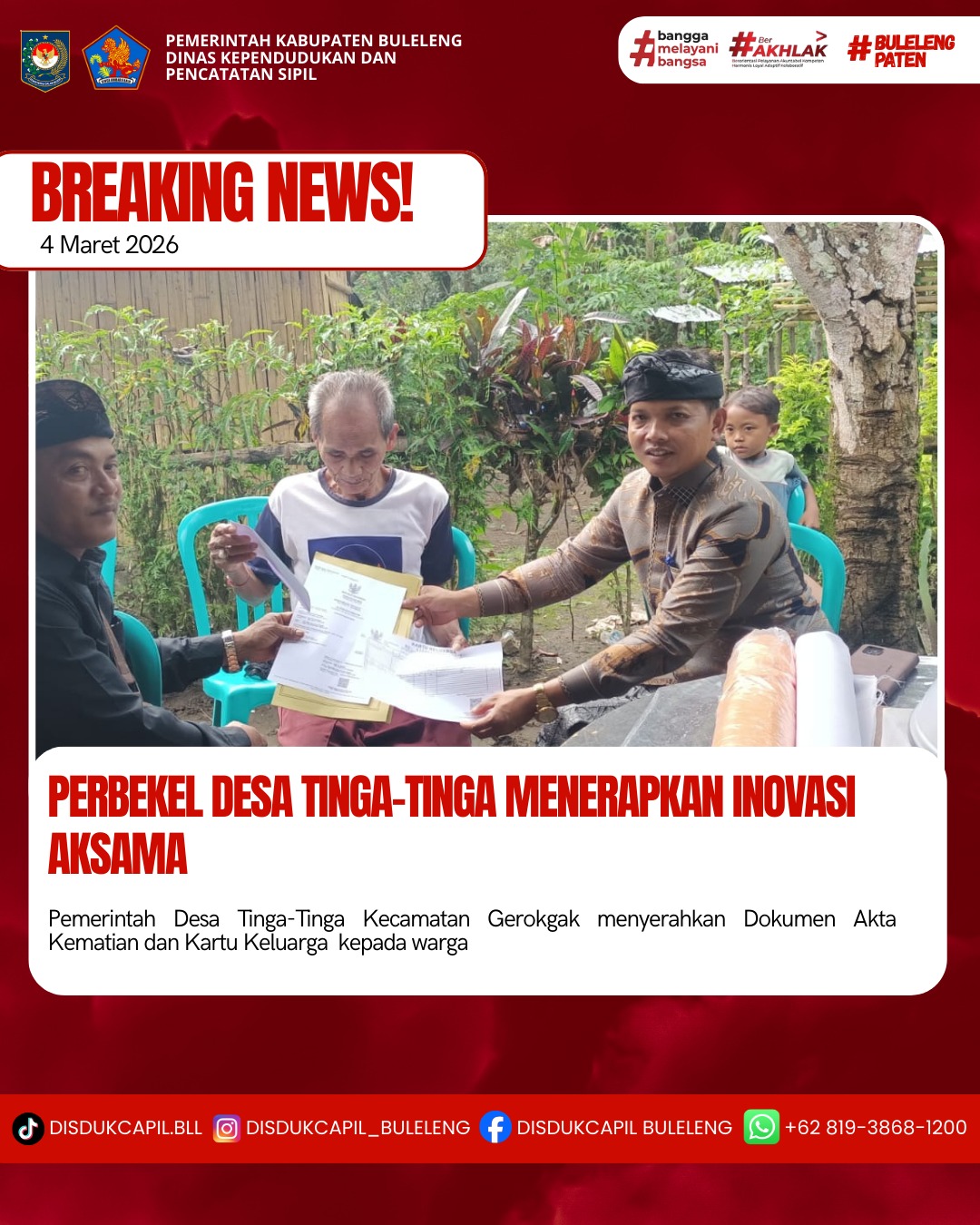 Pemerintah Kabupaten Buleleng melalui Dinas Kependudukan dan Pecatatan Sipil (Disdukcapil) Kabupaten Buleleng memaksimalkan serta mempermudah pelayanan kependudukan masyarakat dengan beberapa inovasi, yakni BALITA (Bayi Lahir Berakta), NYAKSI (Menyerahkan Akta Kawin Saat Acara Perkawinan) dan AKSAMA ( Akta Kematian Diserahkan Saat Masih Berduka) melalui aplikasi Aku Online. Di Desa Tinga-Tinga Kecamatan Gerokgak, telah diterapkan program Aksama (Akta Kematian Diserahkan Saat Masih Berduka) yang dilakukan secara langsung oleh Perbekel Desa Tinga-Tinga I Komang Adi Wirawan di dampingi Kelian Banjar Dinas menyerahkan Akta Kematian dilaksanakan di Banjar DinasTaman Sari dengan penyerahan Akta Kematian warga atas nama Gusti Ayu Suci dan Kartu Keluarga baru kepada Gusti Made Wisaka, Rabu (4/3).