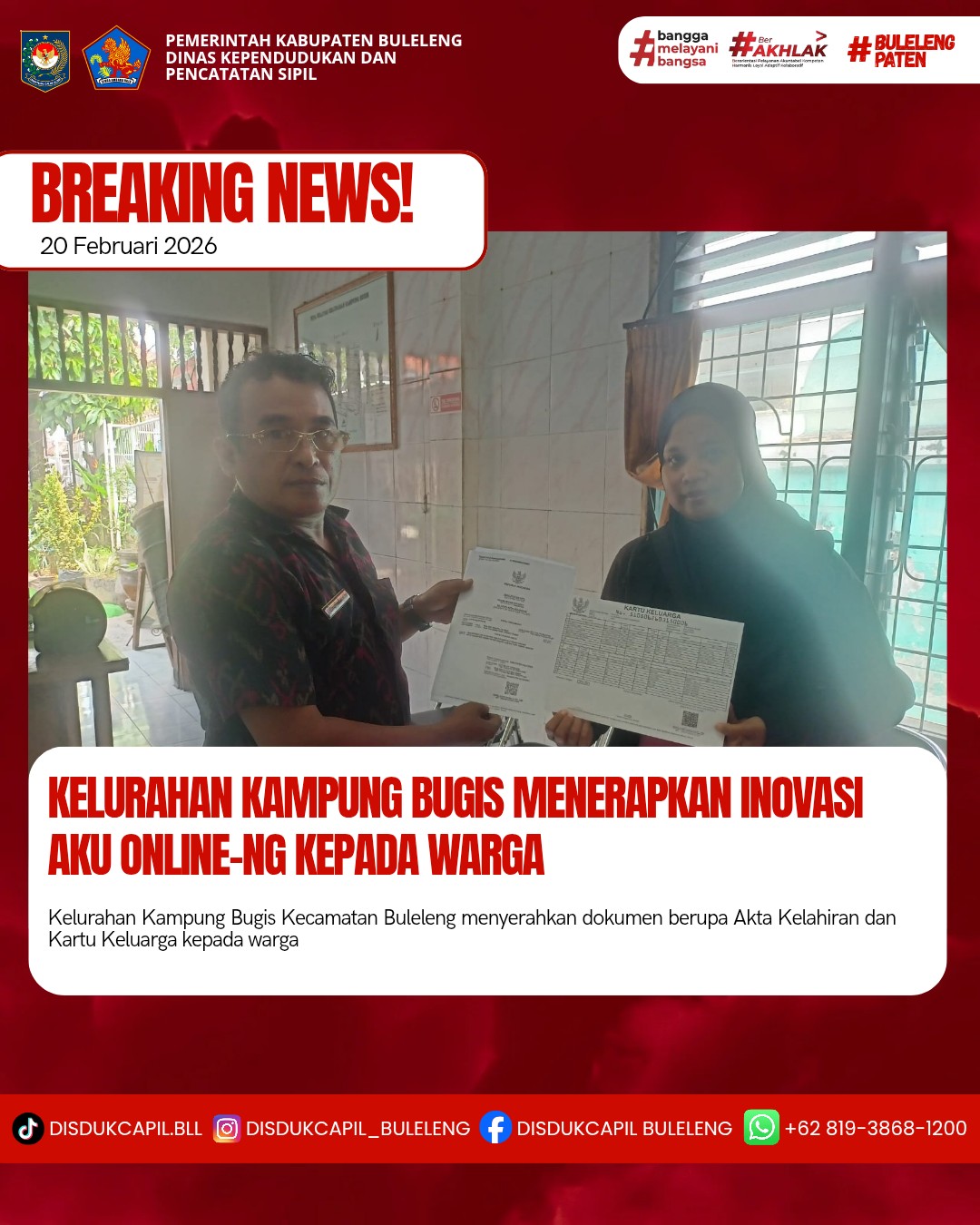 Pemerintah Kabupaten Buleleng melalui Dinas Kependudukan dan Pecatatan Sipil (Disdukcapil) Kabupaten Buleleng memaksimalkan serta mempermudah pelayanan kependudukan masyarakat dengan beberapa inovasi, melalui aplikasi AKU Online-NG. Dimana dalam penerapan aplikasi Aku Online-NG tersebut masyarakat tidak perlu lagi datang ke Dinas Dukcapil untuk melakukan pelayanan langsung cukup dengan datang ke Desa nanti akan dibantu oleh operator Desa masing-masing. Di Kelurahan Kampung Bugis Kecamatan Buleleng, telah diserahkan dokumen kependudukan berupa Akta Kelahiran dan Kartu Keluarga yang diserahkan langsung oleh Operator Kelurahan Kampung Bugis Kecamatan Buleleng, Kabupaten Buleleng, Jumat (20/2).