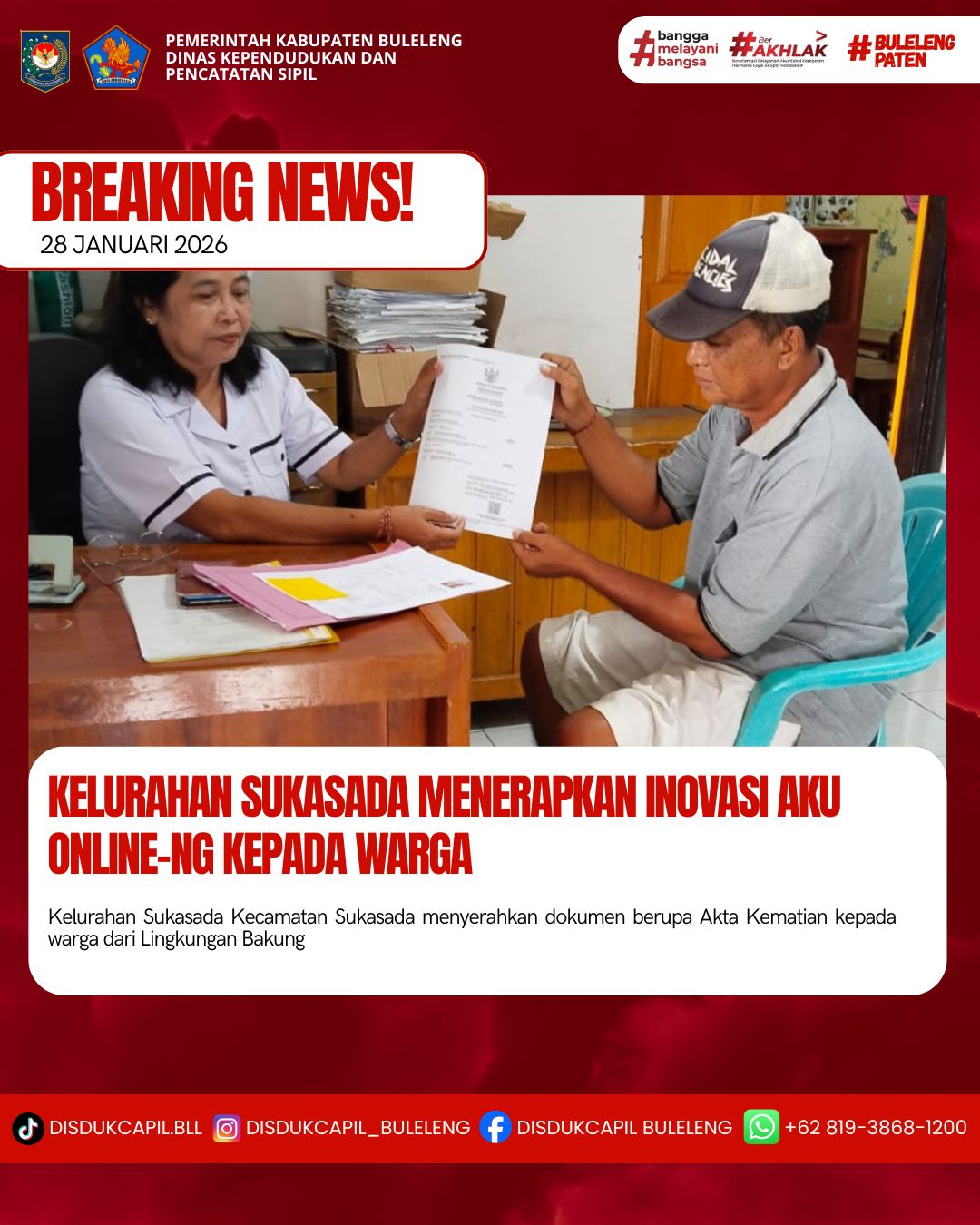 Pemerintah Kabupaten Buleleng melalui Dinas Kependudukan dan Pecatatan Sipil (Disdukcapil) Kabupaten Buleleng memaksimalkan serta mempermudah pelayanan kependudukan masyarakat dengan beberapa inovasi, melalui aplikasi AKU Online-NG. Dimana dalam penerapan aplikasi Aku Online-NG tersebut masyarakat tidak perlu lagi datang ke Dinas Dukcapil untuk melakukan pelayanan langsung cukup dengan datang ke Desa nanti akan dibantu oleh operator Desa masing-masing. Di Kelurahan Sukasada Kecamatan Sukasada, telah diserahkan dokumen kependudukan berupa Akta Kematian atas nama Gusti Made Puri warga Lingkungan Bakung, Kelurahan Sukasada yang diserahkan langsung oleh Kepala Lingkungan Sukasada Kelurahan Sukasada Kecamatan Sukasada, Kabupaten Buleleng, Rabu (28/1).