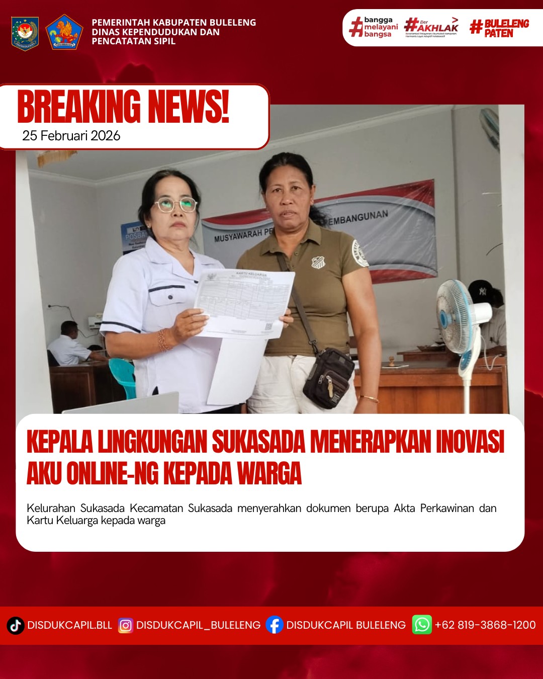 Pemerintah Kabupaten Buleleng melalui Dinas Kependudukan dan Pecatatan Sipil (Disdukcapil) Kabupaten Buleleng memaksimalkan serta mempermudah pelayanan kependudukan masyarakat dengan beberapa inovasi, melalui aplikasi AKU Online-NG. Dimana dalam penerapan aplikasi Aku Online-NG tersebut masyarakat tidak perlu lagi datang ke Dinas Dukcapil untuk melakukan pelayanan langsung cukup dengan datang ke Desa nanti akan dibantu oleh operator Desa masing-masing. Di Kelurahan Sukasada Kecamatan Sukasada, telah diserahkan dokumen kependudukan berupa Akta Perkawinan dan Kartu Keluarga atas nama Kadek Bayu Mega Riswanda warga Lingkungan Sukasada, Kelurahan Sukasada yang diserahkan langsung oleh Kepala Lingkungan Sukasada Kelurahan Sukasada Kecamatan Sukasada, Kabupaten Buleleng, Rabu (25/2).