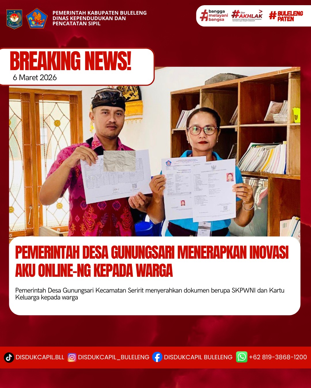 Pemerintah Kabupaten Buleleng melalui Dinas Kependudukan dan Pecatatan Sipil (Disdukcapil) Kabupaten Buleleng memaksimalkan serta mempermudah pelayanan kependudukan masyarakat dengan beberapa inovasi, melalui aplikasi AKU Online-NG. Dimana dalam penerapan aplikasi Aku Online-NG tersebut masyarakat tidak perlu lagi datang ke Dinas Dukcapil untuk melakukan pelayanan langsung cukup dengan datang ke Desa nanti akan dibantu oleh operator Desa masing-masing. Di Desa Gunungsari Kecamatan Seririt, telah diserahkan dokumen kependudukan berupa SKPWNI atas nama PUTU NOPI CAHYA JUNIARTI dan Kartu Keluarga atas nama KETUT PUSATA warga Banjar Dinas Sekar, Desa Gunungsari yang diserahkan oleh Pemerintah Desa Gunungsari kepada warga Banjar Dinas Sekar Desa Gunungsari, bertempat di Kantor Perbekel Desa Gunungsari, Kecamatan Seririt, Kabupaten Buleleng, Jumat (6/3).