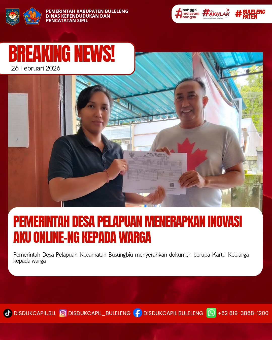 Pemerintah Kabupaten Buleleng melalui Dinas Kependudukan dan Pecatatan Sipil (Disdukcapil) Kabupaten Buleleng memaksimalkan serta mempermudah pelayanan kependudukan masyarakat dengan beberapa inovasi, melalui aplikasi AKU Online-NG. Dimana dalam penerapan aplikasi Aku Online-NG tersebut masyarakat tidak perlu lagi datang ke Dinas Dukcapil untuk melakukan pelayanan langsung cukup dengan datang ke Desa nanti akan dibantu oleh operator Desa masing-masing. Di Desa Pelapuan Kecamatan Busungbiu, telah diserahkan dokumen kependudukan berupa Kartu Keluarga karena perubahan data atas nama Kadek Juliantarawarga Desa Pelapuan yang diserahkan oleh Kasi Pemerintahan Desa Pelapuan bertempat di Kantor Perbekel Desa Pelapuan, Kecamatan Busungbiu, Kabupaten Buleleng, Kamis (26/2).