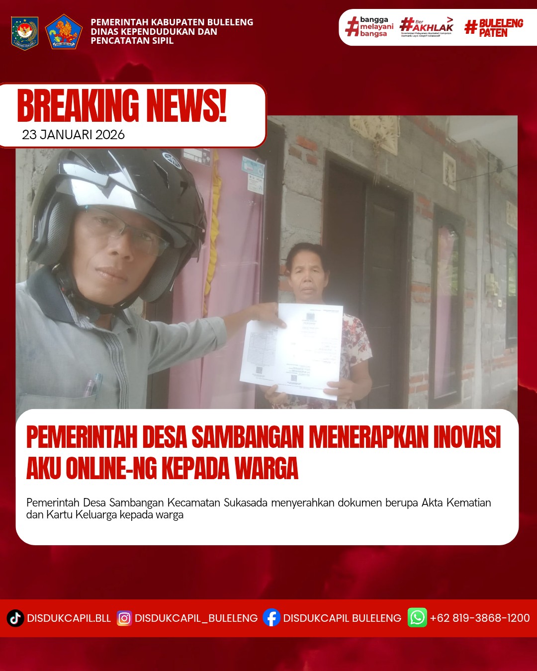 Pemerintah Kabupaten Buleleng melalui Dinas Kependudukan dan Pecatatan Sipil (Disdukcapil) Kabupaten Buleleng memaksimalkan serta mempermudah pelayanan kependudukan masyarakat dengan beberapa inovasi, melalui aplikasi AKU Online-NG. Dimana dalam penerapan aplikasi Aku Online-NG tersebut masyarakat tidak perlu lagi datang ke Dinas Dukcapil untuk melakukan pelayanan langsung cukup dengan datang ke Desa nanti akan dibantu oleh operator Desa masing-masing. Di Desa Sambangan Kecamatan Sukasada, telah diserahkan dokumen kependudukan berupa Akta Kematian atas nama Nyoman Raikidek dan Kartu Keluarga atas nama Sukanasih diserahkan oleh Pemerintahan Desa Sambangan bertempat di Kantor Perbekel Desa Sambangan, Kecamatan Sukasada, Kabupaten Buleleng, Jumat (23/1).