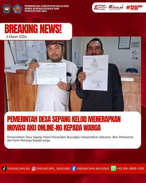 Pemerintah Kabupaten Buleleng melalui Dinas Kependudukan dan Pecatatan Sipil (Disdukcapil) Kabupaten Buleleng memaksimalkan serta mempermudah pelayanan kependudukan masyarakat dengan beberapa inovasi, melalui aplikasi AKU Online. Dimana dalam penerapan aplikasi Aku Online tersebut masyarakat tidak perlu lagi datang ke Dinas Dukcapil untuk melakukan pelayanan langsung cukup dengan datang ke Desa nanti akan dibantu oleh operator Desa masing-masing. Di Desa Sepang Kelod Kecamatan Busungbiu telah diserahkan dokumen kependudukan berupa Akta Perkawinan dan Kartu Keluarga warga Banjar Dinas Gunungsari Desa Sepang Kelod yang diserahkan oleh Kasi Pemerintahan Desa Sepang Kelod, bertempat di Kantor Perbekel Desa Sepang Kelod, Kecamatan Busungbiu, Selasa (3/3).