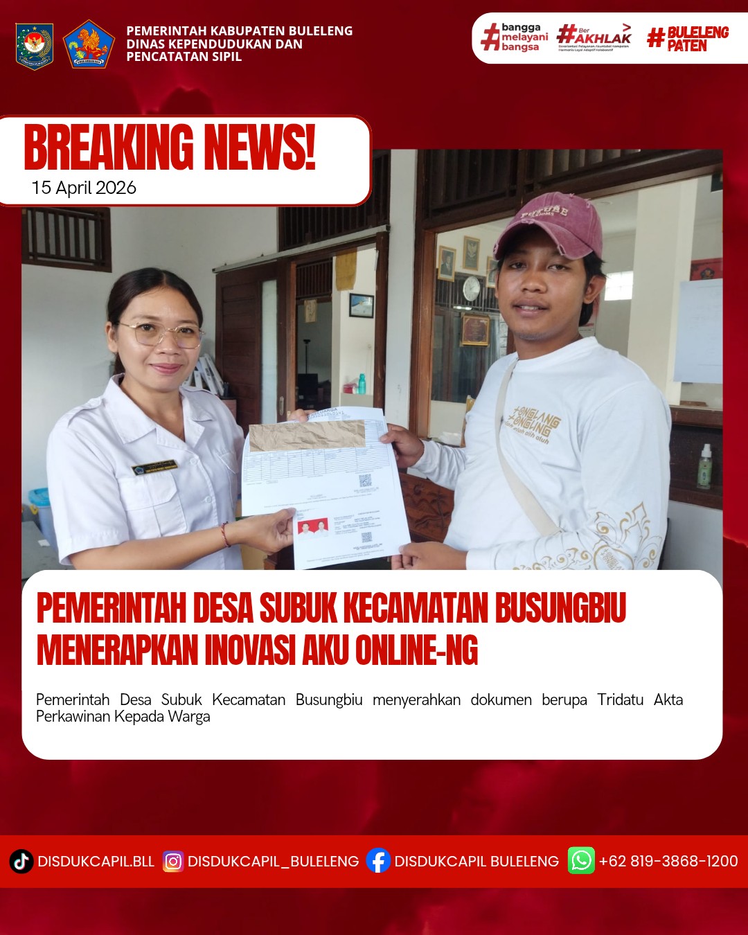 Pemerintah Kabupaten Buleleng melalui Dinas Kependudukan dan Pecatatan Sipil (Disdukcapil) Kabupaten Buleleng memaksimalkan serta mempermudah pelayanan kependudukan masyarakat dengan beberapa inovasi, melalui aplikasi AKU Online-NG. Dimana dalam penerapan aplikasi Aku Online-NG tersebut masyarakat tidak perlu lagi datang ke Dinas Dukcapil untuk melakukan pelayanan langsung, cukup dengan datang ke Desa nanti akan dibantu oleh operator Desa masing-masing. Di Desa Subuk Kecamatan Busungbiu, telah diserahkan dokumen kependudukan berupa Akta Perkawinan dan Kartu Keluarga atas nama Kadek Agus Putrawan dan Ni Putu Bintang Cahyani yang diserahkan oleh Pemerintah Desa Subuk bertempat di Kantor Perbekel Desa Subuk, Kecamatan Busungbiu, Kabupaten Buleleng, Rabu (15/4).