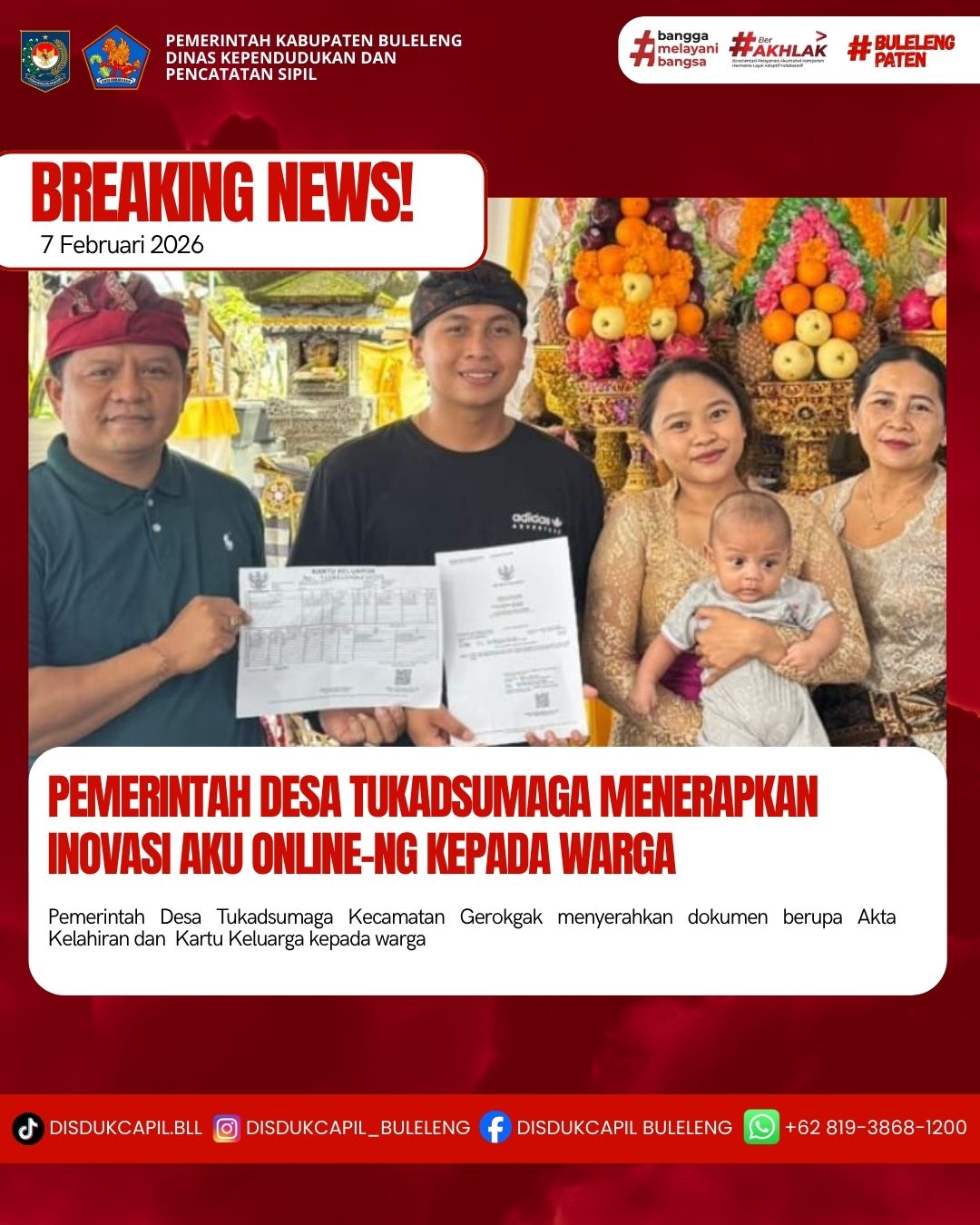 Pemerintah Kabupaten Buleleng melalui Dinas Kependudukan dan Pecatatan Sipil (Disdukcapil) Kabupaten Buleleng memaksimalkan serta mempermudah pelayanan kependudukan masyarakat dengan beberapa inovasi, melalui aplikasi AKU Online-NG. Dimana dalam penerapan aplikasi Aku Online-NG tersebut masyarakat tidak perlu lagi datang ke Dinas Dukcapil untuk melakukan pelayanan langsung cukup dengan datang ke Desa nanti akan dibantu oleh operator Desa masing-masing. Di Desa Tukadsumaga Kecamatan Gerokgak, telah diserahkan dokumen kependudukan berupa Akta Kelahiran atas nama Putu Jayden Shankaradita Putra dan Kartu Keluarga atas nama Made Jery Sukma Parandita warga Desa Tukadsumaga yang diserahkan oleh Kelian Banjar Dinas Bulakan di Desa Tukadsumaga, Sabtu (7/2).
