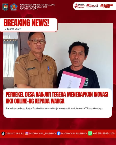 Pemerintah Kabupaten Buleleng melalui Dinas Kependudukan dan Pecatatan Sipil (Disdukcapil) Kabupaten Buleleng memaksimalkan serta mempermudah pelayanan kependudukan masyarakat dengan beberapa inovasi, melalui aplikasi AKU Online-NG. Dimana dalam penerapan aplikasi Aku Online-NG tersebut masyarakat tidak perlu lagi datang ke Dinas Dukcapil untuk melakukan pelayanan langsung cukup dengan datang ke Desa nanti akan dibantu oleh operator Desa masing-masing. Di Desa Banjar Tegeha Kecamatan Banjar, telah diserahkan dokumen kependudukan berupa KTP atas nama I Gede Egi Prayoga warga Desa Banjar Dinas Tangeb Desa Banjar Tegeha yang diserahkan secara langsung oleh Perbekel Desa Banjar Tegeha Ida Bagus Komang Sistiadi, Senin (2/3).