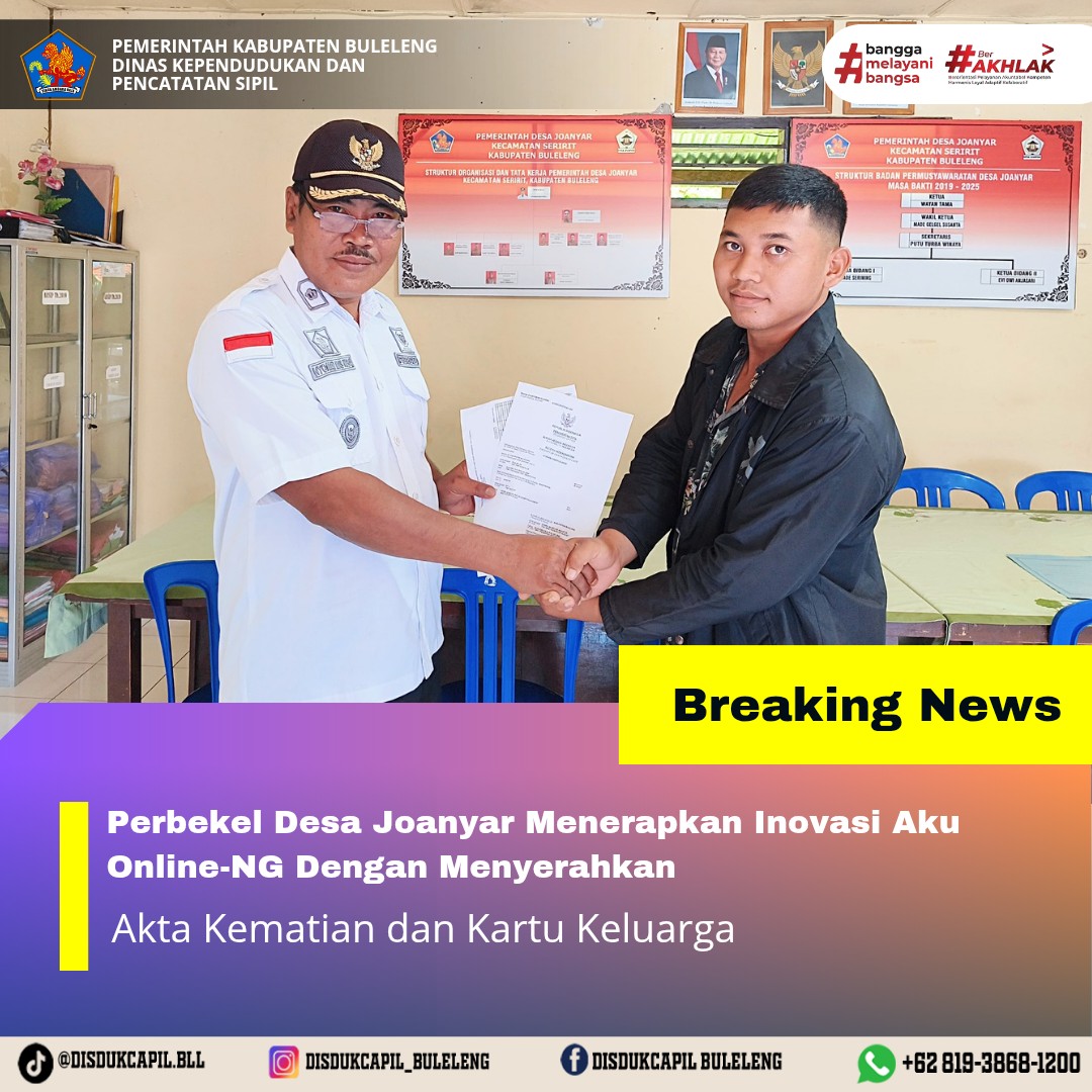 Pemerintah Kabupaten Buleleng melalui Dinas Kependudukan dan Pecatatan Sipil (Disdukcapil) Kabupaten Buleleng memaksimalkan serta mempermudah pelayanan kependudukan masyarakat dengan beberapa inovasi, melalui aplikasi AKU Online-NG. Dimana dalam penerapan aplikasi Aku Online-NG tersebut masyarakat tidak perlu lagi datang ke Dinas Dukcapil untuk melakukan pelayanan langsung cukup dengan datang ke Desa nanti akan dibantu oleh operator Desa masing-masing. Di Desa Joanyar Kecamatan Seririt, telah diserahkan dokumen kependudukan berupa Akta Kematian dan Kartu Keluarga atas nama Ketut Badung warga Desa Joanyar Kecamatan Seririt oleh Perbekel Desa Joanyar Nyoman Mas Nesa dan diterima oleh cucunya langsung, Rabu (1/10).