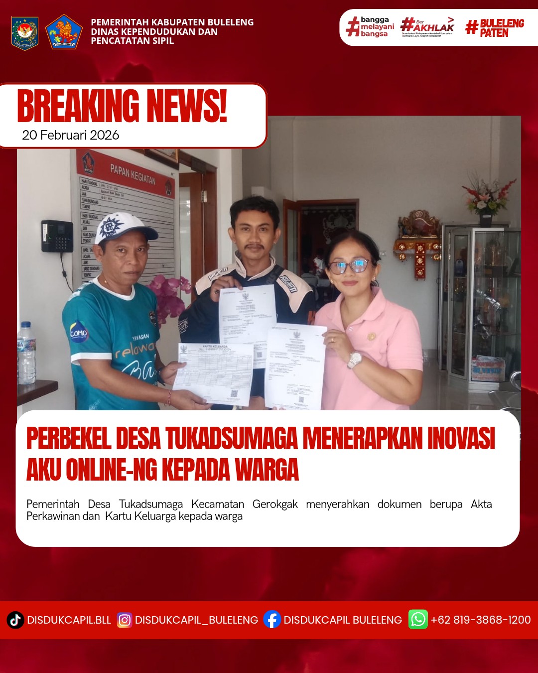 Pemerintah Kabupaten Buleleng melalui Dinas Kependudukan dan Pecatatan Sipil (Disdukcapil) Kabupaten Buleleng memaksimalkan serta mempermudah pelayanan kependudukan masyarakat dengan beberapa inovasi, melalui aplikasi AKU Online-NG. Dimana dalam penerapan aplikasi Aku Online-NG tersebut masyarakat tidak perlu lagi datang ke Dinas Dukcapil untuk melakukan pelayanan langsung cukup dengan datang ke Desa nanti akan dibantu oleh operator Desa masing-masing. Di Desa Tukadsumaga Kecamatan Gerokgak, telah diserahkan dokumen kependudukan berupa Akta Perkawinan dan Kartu Keluarga atas nama I Gede Aprianto yang diserahkan oleh Perbekel Desa Tukadsumaga Anak Agung Sri Wathi didampingi oleh Kelian Banjar Dinas Mawar I Kadek Edi Purnama Yasa di Desa Tukadsumaga, Jumat (20/2).