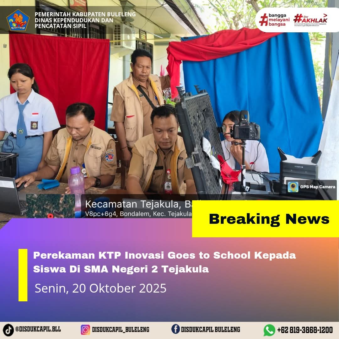 Pada kali ini Senin, 20 Oktober 2025 pelayanan perekaman KTP-el dilaksanakan di SMA Negeri 2 Tejakula. Hasil perekaman di SMA Negeri 2 Tejakula dengan data BNBA sebanyak 5 orang dan total yang melakukan perekaman sebanyak 31 orang, dimana hasil perekaman data di dalam BNBA yang melakukan perekaman sebanyak 5 orang dan data di luar BNBA sebanyak 26 orang yang melakukan perekaman. Tidak ada sisa dalam BNBA yang belum perekaman.