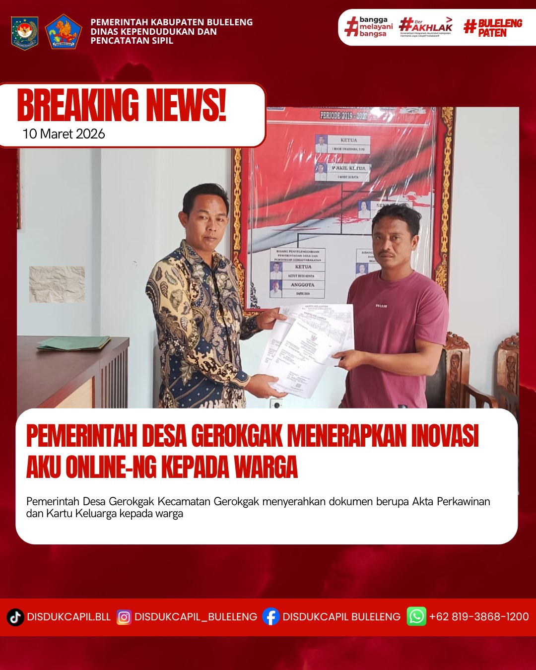 Pemerintah Kabupaten Buleleng melalui Dinas Kependudukan dan Pecatatan Sipil (Disdukcapil) Kabupaten Buleleng memaksimalkan serta mempermudah pelayanan kependudukan masyarakat dengan beberapa inovasi, melalui aplikasi AKU Online-NG. Dimana dalam penerapan aplikasi Aku Online-NG tersebut masyarakat tidak perlu lagi datang ke Dinas Dukcapil untuk melakukan pelayanan langsung cukup dengan datang ke Desa nanti akan dibantu oleh operator Desa masing-masing. Di Desa Gerokgak Kecamatan Gerokgak, telah diserahkan dokumen kependudukan berupa Akta Perkawinan atas nama Komang Agus Wibawa dan Luh Sujani dan Kartu Keluarga yang diserahkan langsung oleh Kelian Banjar Dinas Batuagung Pidada Desa Gerokgak di Desa Gerokgak, Kecamatan Gerokgak, Kabupaten Buleleng, Selasa (10/3).