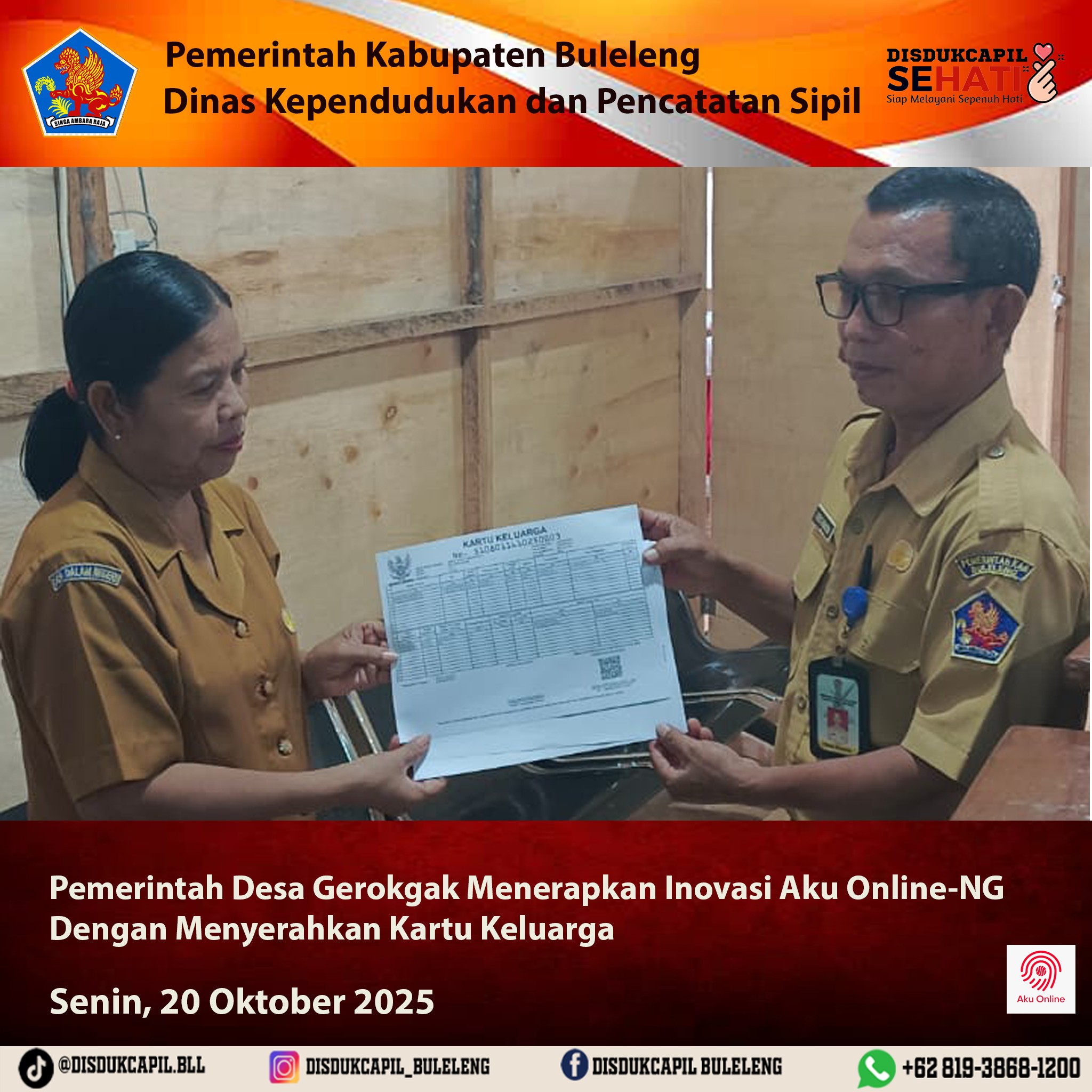 Pemerintah Kabupaten Buleleng melalui Dinas Kependudukan dan Pecatatan Sipil (Disdukcapil) Kabupaten Buleleng memaksimalkan serta mempermudah pelayanan kependudukan masyarakat dengan beberapa inovasi, melalui aplikasi AKU Online. Dimana dalam penerapan aplikasi Aku Online tersebut masyarakat tidak perlu lagi datang ke Dinas Dukcapil untuk melakukan pelayanan langsung cukup dengan datang ke Desa nanti akan dibantu oleh operator Desa masing-masing. Di Desa Gerokgak Kecamatan Gerokgak telah diserahkan dokumen kependudukan berupa Kartu Keluarga atas nama Made Angga Mahardika yang diserahkan oleh Kasi Pemerintahan Desa Gerokgak Kecamatan Gerokgak, Senin (20/10).