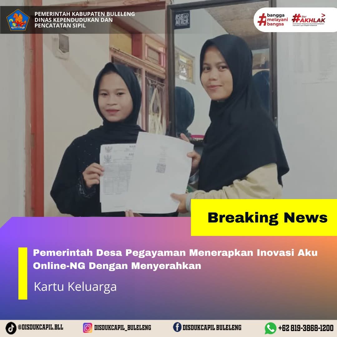 Pemerintah Kabupaten Buleleng melalui Dinas Kependudukan dan Pecatatan Sipil (Disdukcapil) Kabupaten Buleleng memaksimalkan serta mempermudah pelayanan kependudukan masyarakat dengan beberapa inovasi, melalui aplikasi AKU Online-NG. Dimana dalam penerapan aplikasi Aku Online-NG tersebut masyarakat tidak perlu lagi datang ke Dinas Dukcapil untuk melakukan pelayanan langsung cukup dengan datang ke Desa nanti akan dibantu oleh operator Desa masing-masing. Di Desa Pegayaman Kecamatan Sukasada, telah diserahkan dokumen kependudukan berupa Kartu Keluarga karena pisah Kartu Keluarga kepada warga atas nama Febri Matori yang beralamat di Banjar Dinas Kubu Lebah Desa Pegayaman yang diserahkan langsung oleh Kasi Pemerintahan Desa Pegayaman, Jumat (12/12).