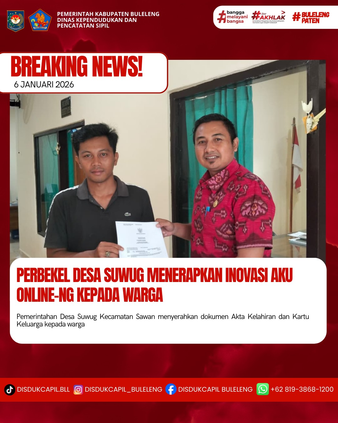 Pemerintah Kabupaten Buleleng melalui Dinas Kependudukan dan Pecatatan Sipil (Disdukcapil) Kabupaten Buleleng memaksimalkan serta mempermudah pelayanan kependudukan masyarakat dengan beberapa inovasi, melalui aplikasi AKU Online-NG. Dimana dalam penerapan aplikasi Aku Online-NG tersebut masyarakat tidak perlu lagi datang ke Dinas Dukcapil untuk melakukan pelayanan langsung cukup dengan datang ke Desa nanti akan dibantu oleh operator Desa masing-masing. Di Desa Suwug Kecamatan Sawan, Bapak Perbekel Desa Suwug KETUT SUADNYANA,SE telah menyerahkan dokumen kependudukan berupa Akta Kelahiran dan Kartu Keluarga yang diserahkan secara lansung oleh Perbekel Desa Suwug, Selasa (6/1).