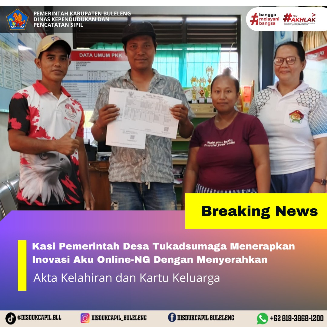 Pemerintah Kabupaten Buleleng melalui Dinas Kependudukan dan Pecatatan Sipil (Disdukcapil) Kabupaten Buleleng memaksimalkan serta mempermudah pelayanan kependudukan masyarakat dengan beberapa inovasi, melalui aplikasi AKU Online. Dimana dalam penerapan aplikasi Aku Online tersebut masyarakat tidak perlu lagi datang ke Dinas Dukcapil untuk melakukan pelayanan langsung cukup dengan datang ke Desa nanti akan dibantu oleh operator Desa masing-masing. Di Desa Tukadsumaga Kecamatan Gerokgak telah diserahkan dokumen kependudukan berupa Akta Kelahiran atas nama Ni Komang Oliviya Vimala Dewi dan Kartu Keluarga atas nama I Ketut Suarjaya warga Banjar Dinas Gandongan Desa Tukadsumaga oleh Kasi Pemerintahan Desa Tukadsumaga didampingi oleh Kelian Banjar Dinas Gandongan, Desa Tukadsumaga, Kecamatan Gerokgak, Jumat (26/9).