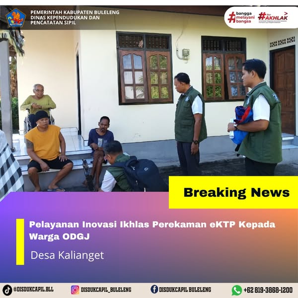 Dinas Kependudukan dan Pencatatan Sipil Kabupaten Buleleng terus berupaya memberikan pelayanan maksimal pada masyarakat dalam rangka meningkatkan kesadaran kepada masyarakat akan pentingnya memiliki dokumen kependudukan salah satunya Kartu Tanda Penduduk (KTP). Berbagai macam inovasi dikembangkan untuk mempermudah masyarakat dapat memiliki dokumen kependudukan. Salah satu Inovasi yang diberikan kepada masyarakat adalah Inovasi "IKHLAS" (Tim Khusus Layanan Untuk Orang Sakit dan Disabilitas) yaitu jembut bola perekaman KTP-el ke rumah warga yang tidak bisa datang langsung ke Kantor Disdukcapil untuk melakukan perekaman eKTP. Sesuai dengan Undang-Undang Republik Indonesia Nomor 24 Tahun 2013 tentang Administrasi Kependudukan, menyatakan bahwa Penduduk Warga Negara Indonesia dan Orang Asing yang memiliki Izin Tinggal Tetap yang telah berumur 17 (tujuh belas) tahun atau telah kawin atau pernah kawin wajib memiliki KTP-el. Namun demikian, ada beberapa penduduk yang tidak bisa datang langsung ke Kantor Dinas Kependudukan dan Pencatatan Sipil Kabupaten Buleleng karena kendala kesehatan dan usia lanjut.