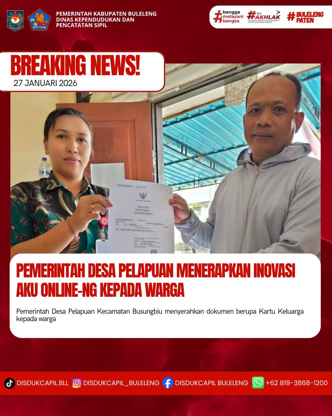 Pemerintah Kabupaten Buleleng melalui Dinas Kependudukan dan Pecatatan Sipil (Disdukcapil) Kabupaten Buleleng memaksimalkan serta mempermudah pelayanan kependudukan masyarakat dengan beberapa inovasi, melalui aplikasi AKU Online-NG. Dimana dalam penerapan aplikasi Aku Online-NG tersebut masyarakat tidak perlu lagi datang ke Dinas Dukcapil untuk melakukan pelayanan langsung cukup dengan datang ke Desa nanti akan dibantu oleh operator Desa masing-masing. Di Desa Pelapuan Kecamatan Busungbiu, telah diserahkan dokumen kependudukan berupa Akta Kelahiran atas nama Kadek Bisma Taruna Dalem warga Desa Pelapuan yang diserahkan oleh Kasi Pemerintahan Desa Pelapuan bertempat di Kantor Perbekel Desa Pelapuan, Kecamatan Busungbiu, Kabupaten Buleleng, Selasa (27/1).