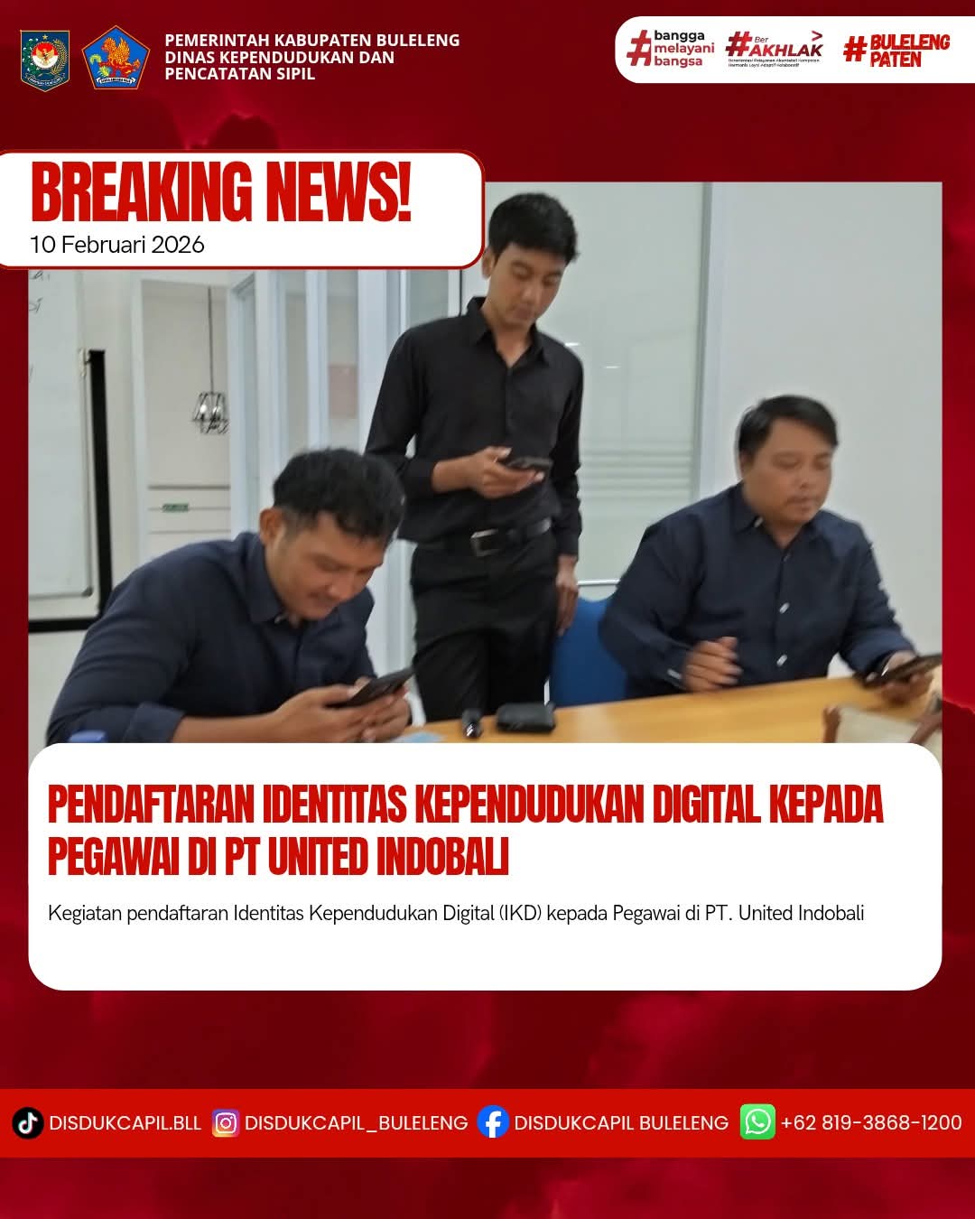 Menerapkan aturan pemerintah tersebut, Dinas Kependudukan dan Pencatatan Sipil Kabupaten Buleleng menyelenggarakan Pendaftaran Identitas Kependudukan Digital ke sekolah-sekolah, Dinas, Lembaga dan Perusahaan secara bergilir setiap harinya. Kali ini pelaksanaan pendaftaran Identitas Kependudukan Digital kepada Pegawai yang dilaksanakan di PT. United Indobali (Suzuki Singaraja), Selasa (10/2).