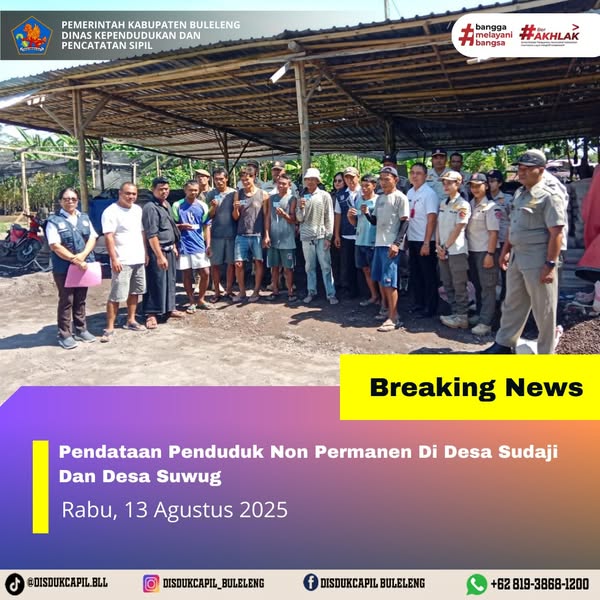 Kali ini Rabu, 13 Agustus 2025, Dinas Kependudukan dan Pencatatan Sipil Kabupaten Buleleng melaksanakan kegiatan pendataan penduduk Non Permanen di Desa Sudaji Dan Desa Suwug Kecamatan Sawan. Dari pendataan penduduk kali ini didapatkan hasil :