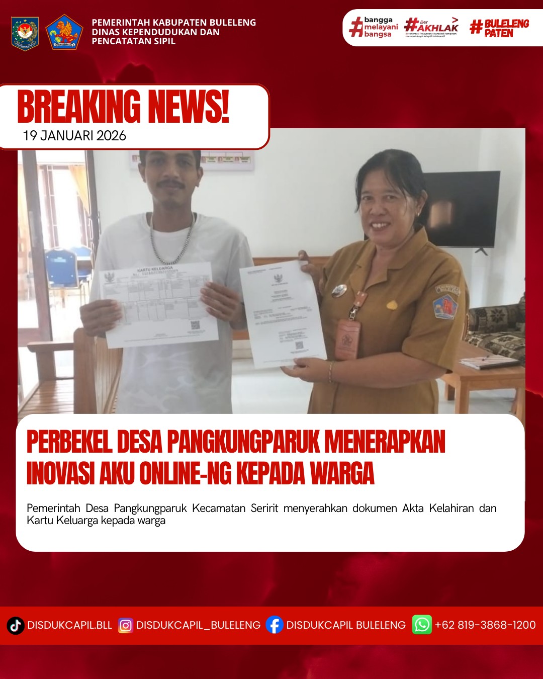 Pemerintah Kabupaten Buleleng melalui Dinas Kependudukan dan Pecatatan Sipil (Disdukcapil) Kabupaten Buleleng memaksimalkan serta mempermudah pelayanan kependudukan masyarakat dengan beberapa inovasi, melalui aplikasi AKU Online-NG. Dimana dalam penerapan aplikasi Aku Online-NG tersebut masyarakat tidak perlu lagi datang ke Dinas Dukcapil untuk melakukan pelayanan langsung cukup dengan datang ke Desa nanti akan dibantu oleh operator Desa masing-masing. Di Desa Pangkungparuk Kecamatan Seririt, telah diserahkan dokumen kependudukan berupa Akta Kelahiran atas nama Made Bagus Dwi Pradipta dan Kartu Keluarga atas nama Gede Sulianto warga Banjar Dinas Laba Nangga Desa Pangkungparuk Kecamatan Seririt oleh Perbekel Desa Pangkungparuk Ni Nyoman Sekarini, Senin (19/1).