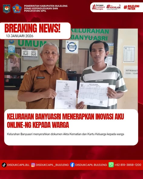 Pemerintah Kabupaten Buleleng melalui Dinas Kependudukan dan Pecatatan Sipil (Disdukcapil) Kabupaten Buleleng memaksimalkan serta mempermudah pelayanan kependudukan masyarakat dengan beberapa inovasi, melalui aplikasi AKU Online-NG. Dimana dalam penerapan aplikasi Aku Online-NG tersebut masyarakat tidak perlu lagi datang ke Dinas Dukcapil untuk melakukan pelayanan langsung cukup dengan datang ke Desa nanti akan dibantu oleh operator Desa masing-masing. Di Kelurahan Banyuasri Kecamatan Buleleng, telah diserahkan dokumen kependudukan berupa Akta Kematian atas nama Nyoman Sti Artati dan Kartu Keluarga atas nama Komang Agus Juniawan warga dari Jalan Pidada Gang II Kelurahan Banyuasri yang diserahkan langsung oleh Kelurahan Banyuasri, Kecamatan Buleleng, Kabupaten Buleleng, Senin (12/1).