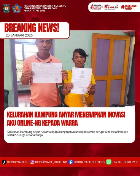 Pemerintah Kabupaten Buleleng melalui Dinas Kependudukan dan Pecatatan Sipil (Disdukcapil) Kabupaten Buleleng memaksimalkan serta mempermudah pelayanan kependudukan masyarakat dengan beberapa inovasi, melalui aplikasi AKU Online-NG. Dimana dalam penerapan aplikasi Aku Online-NG tersebut masyarakat tidak perlu lagi datang ke Dinas Dukcapil untuk melakukan pelayanan langsung cukup dengan datang ke Desa nanti akan dibantu oleh operator Desa masing-masing. Di Kelurahan Kampung Anyar Kecamatan Buleleng, telah diserahkan dokumen kependudukan berupa akta kelahiran atas nama Wayan Sri Murtini dan Kartu Keluarga yang diserahkan langsung oleh Kelurahan Kampung Anyar Kecamatan Buleleng, Kabupaten Buleleng, Jumat (23/1).