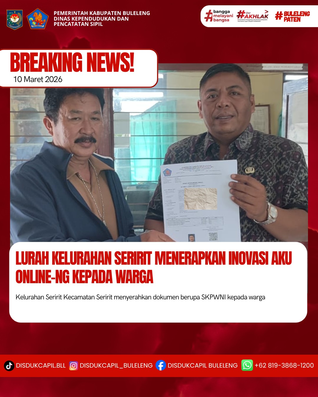 Pemerintah Kabupaten Buleleng melalui Dinas Kependudukan dan Pecatatan Sipil (Disdukcapil) Kabupaten Buleleng memaksimalkan serta mempermudah pelayanan kependudukan masyarakat dengan beberapa inovasi, melalui aplikasi AKU Online-NG. Dimana dalam penerapan aplikasi Aku Online-NG tersebut masyarakat tidak perlu lagi datang ke Dinas Dukcapil untuk melakukan pelayanan langsung cukup dengan datang ke Desa nanti akan dibantu oleh operator Desa masing-masing. Di Kelurahan Seririt Kecamatan Seririt, telah diserahkan dokumen kependudukan berupa SKPWNI atas nama I Nengah Marjaya yang diserahkan langsung oleh Lurah Kelurahan Seririt I Gusti Putu Sugiro, S.Sos,M.AP di Kecamatan Seririt, Kabupaten Buleleng, Selasa (10/3).