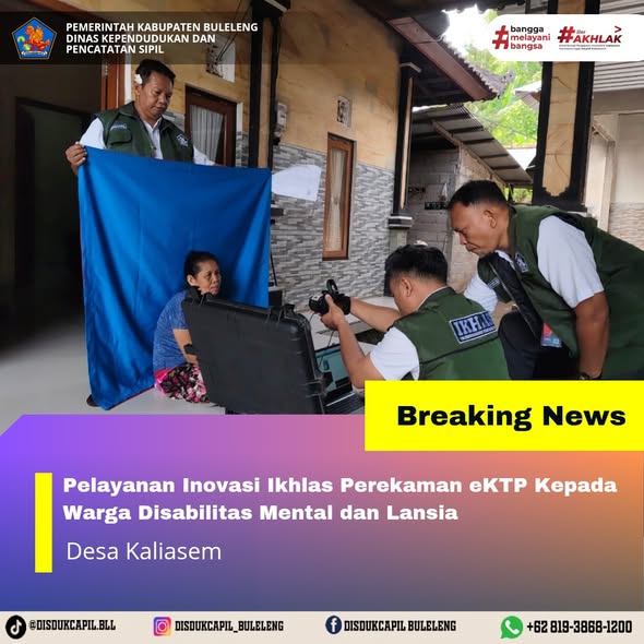 Dinas Kependudukan dan Pencatatan Sipil Kabupaten Buleleng terus berupaya memberikan pelayanan maksimal pada masyarakat dalam rangka meningkatkan kesadaran kepada masyarakat akan pentingnya memiliki dokumen kependudukan salah satunya Kartu Tanda Penduduk (KTP). Berbagai macam inovasi dikembangkan untuk mempermudah masyarakat dapat memiliki dokumen kependudukan. Salah satu Inovasi yang diberikan kepada masyarakat adalah Inovasi "IKHLAS" (Tim Khusus Layanan Untuk Orang Sakit dan Disabilitas) yaitu jembut bola perekaman KTP-el ke rumah warga yang tidak bisa datang langsung ke Kantor Disdukcapil untuk melakukan perekaman eKTP. Sesuai dengan Undang-Undang Republik Indonesia Nomor 24 Tahun 2013 tentang Administrasi Kependudukan, menyatakan bahwa Penduduk Warga Negara Indonesia dan Orang Asing yang memiliki Izin Tinggal Tetap yang telah berumur 17 (tujuh belas) tahun atau telah kawin atau pernah kawin wajib memiliki KTP-el. Namun demikian, ada beberapa penduduk yang tidak bisa datang langsung ke Kantor Dinas Kependudukan dan Pencatatan Sipil Kabupaten Buleleng karena kendala kesehatan dan usia lanjut.