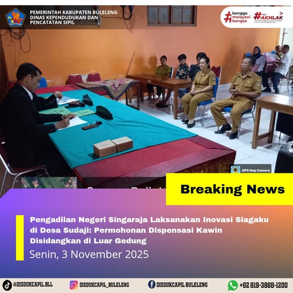 Buleleng – Pengadilan Negeri Singaraja Kelas IB sukses melaksanakan Inovasi Siagaku (Sidang di luar gedung dan layanan administrasi kependudukan terpadu) di Desa Sudaji, Kecamatan Sawan, pada hari Senin, 3 November 2025.